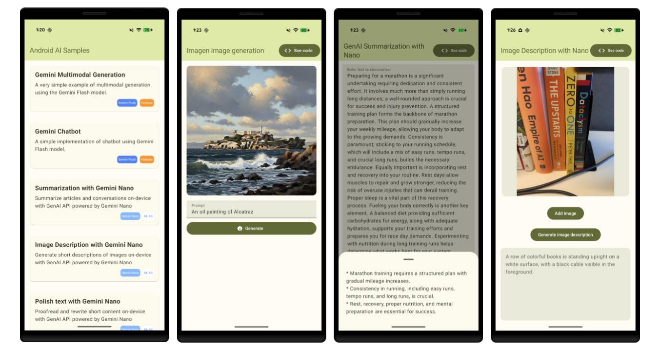 The Android AI Sample Catalog is a standalone application that gives you access to individual, self-contained samples that illustrate the possibilities for generative AI capabilities that can be unlocked by Google's AI models.