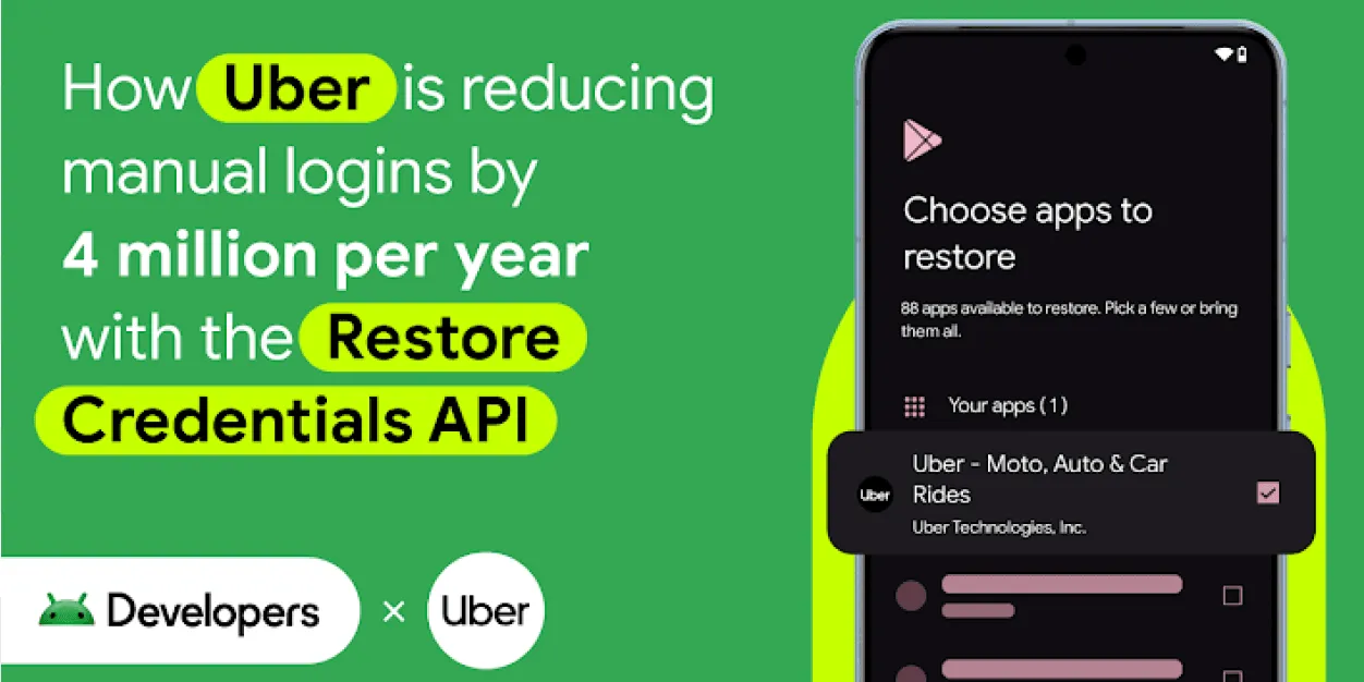 Uber, yeni cihazda oturum açma sürecini kolaylaştırmak için Android Restore Credentials API'den yararlandı. Bu sayede, yılda 4 milyon manuel oturum açma işleminin azalması ve kullanıcı elde tutma oranının artması bekleniyor.
