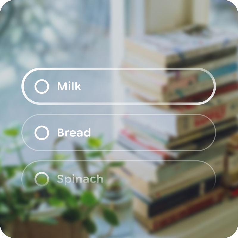 Die Designsprache von Jetpack Compose Glimmer bietet ein vereinfachtes Design für optimale Sichtbarkeit auf Brillen. Farbe und Typ können für semantischen Ausdruck und App-Kohäsion angepasst werden.