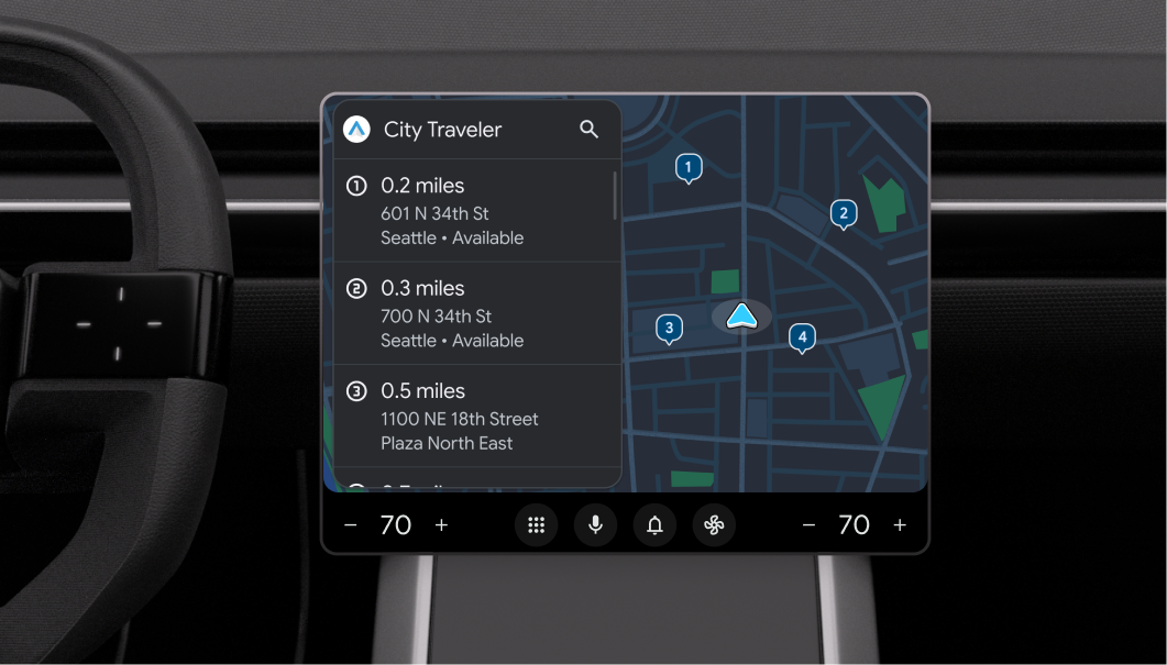 Android for Cars는 주차 및 충전 옵션 찾기부터 날씨 확인, 이동 중 홈 기기와의 통신에 이르기까지 운전자의 여정을 지원하는 다양한 앱 환경을 만들 수 있는 템플릿을 제공합니다.