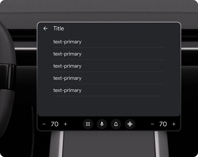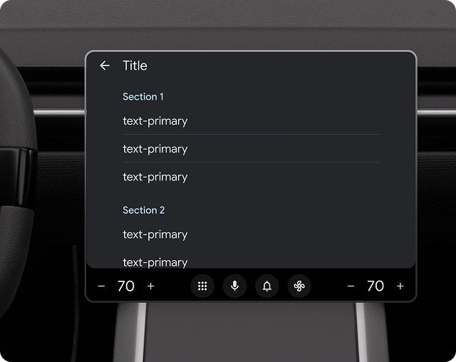 Jumlah teks sekunder yang diizinkan di setiap baris daftar bervariasi, bergantung pada apakah mobil diparkir atau sedang berjalan. Untuk meminimalkan gangguan, teks dipotong menjadi 2 baris saat mengemudi. Teks apa pun yang dimaksudkan untuk dibaca saat mengemudi harus ditampilkan di awal teks sekunder.