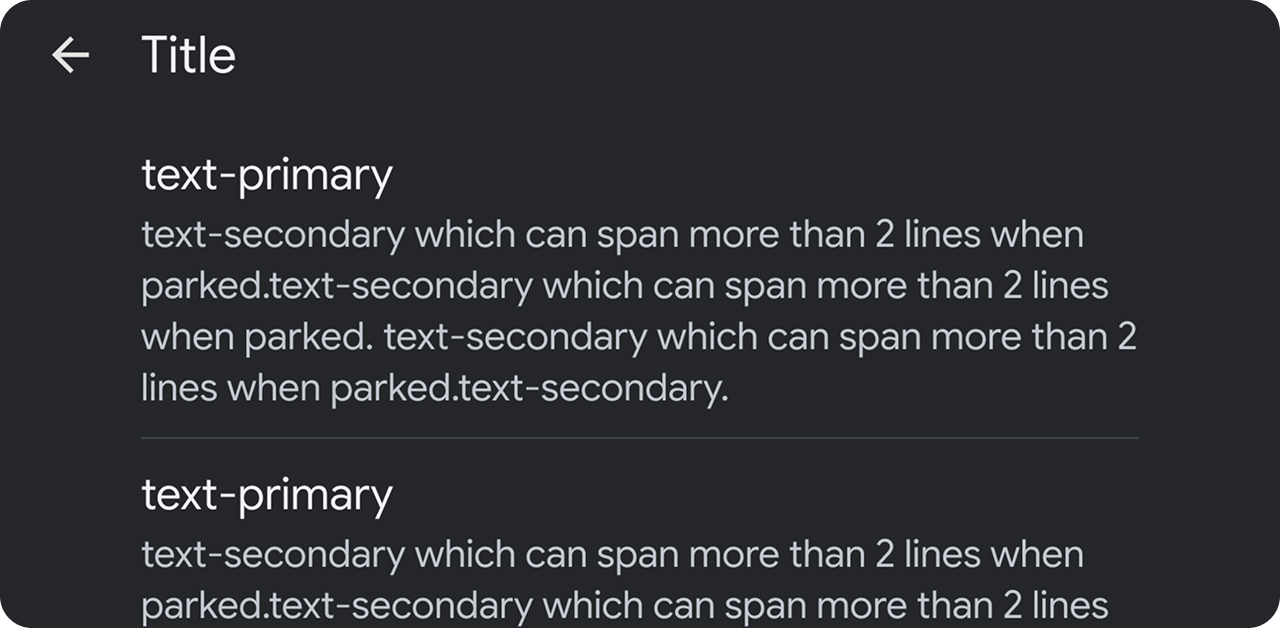 - Jumlah teks per item. Teks sekunder di baris daftar dapat lebih panjang dari 2 baris saat diparkir. Lihat Teks daftar lainnya saat diparkir.