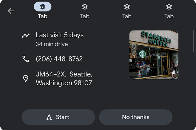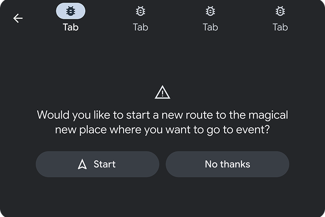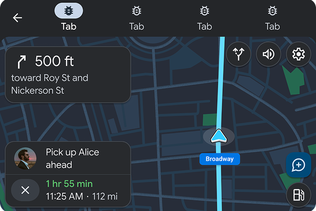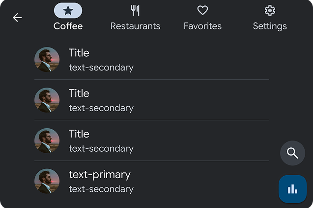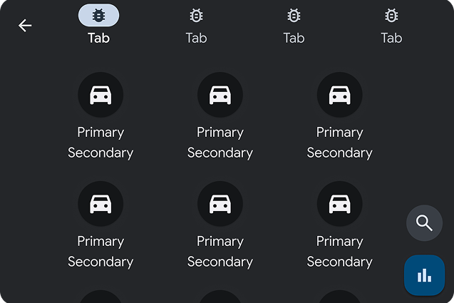 - Barra de pestañas con el ícono de la app y hasta 4 pestañas. Cada pestaña debe proporcionar un ícono y un título.