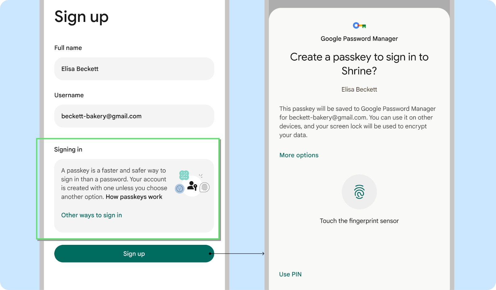 नया खाता बनाते समय, उपयोगकर्ता पहले से ही यह सोच रहे होते हैं कि वे आने वाले समय में उस खाते में कैसे साइन इन करेंगे. यह पासकी के बारे में बताने का एक अच्छा मौका है. साथ ही, यह भी बताएं कि साइन इन करने के लिए, पासकी का इस्तेमाल करना कितना आसान और सुरक्षित है.