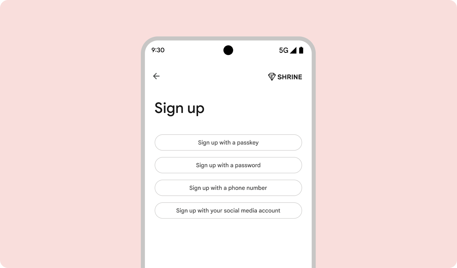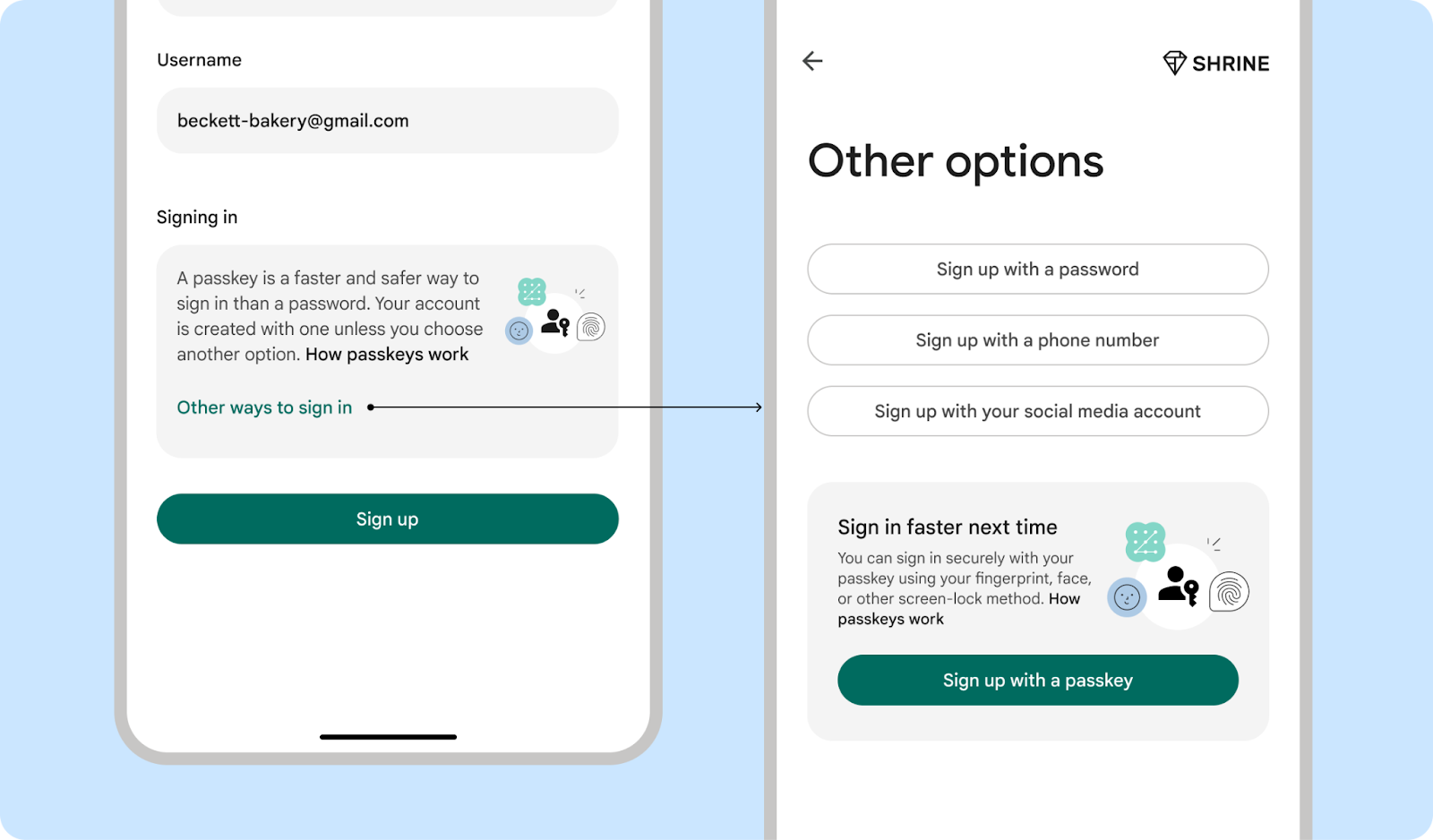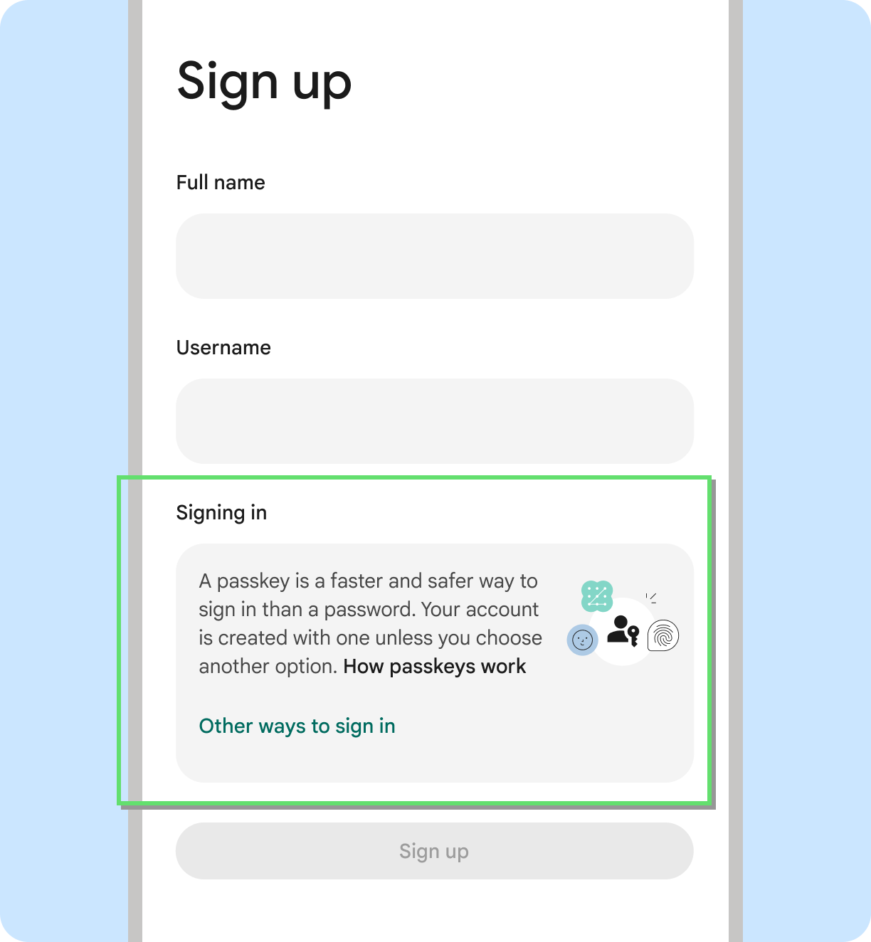 जब उपयोगकर्ता नया खाता बनाते हैं, तो इन चीज़ों के लिए पासकी को डिफ़ॉल्ट विकल्प के तौर पर प्राथमिकता दें खाता बनाना. हालांकि, पक्का करें कि उपयोगकर्ता चाहें, तो साइन इन करने के अन्य विकल्पों का इस्तेमाल कर सकें.