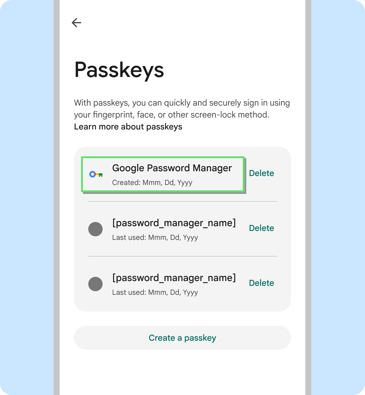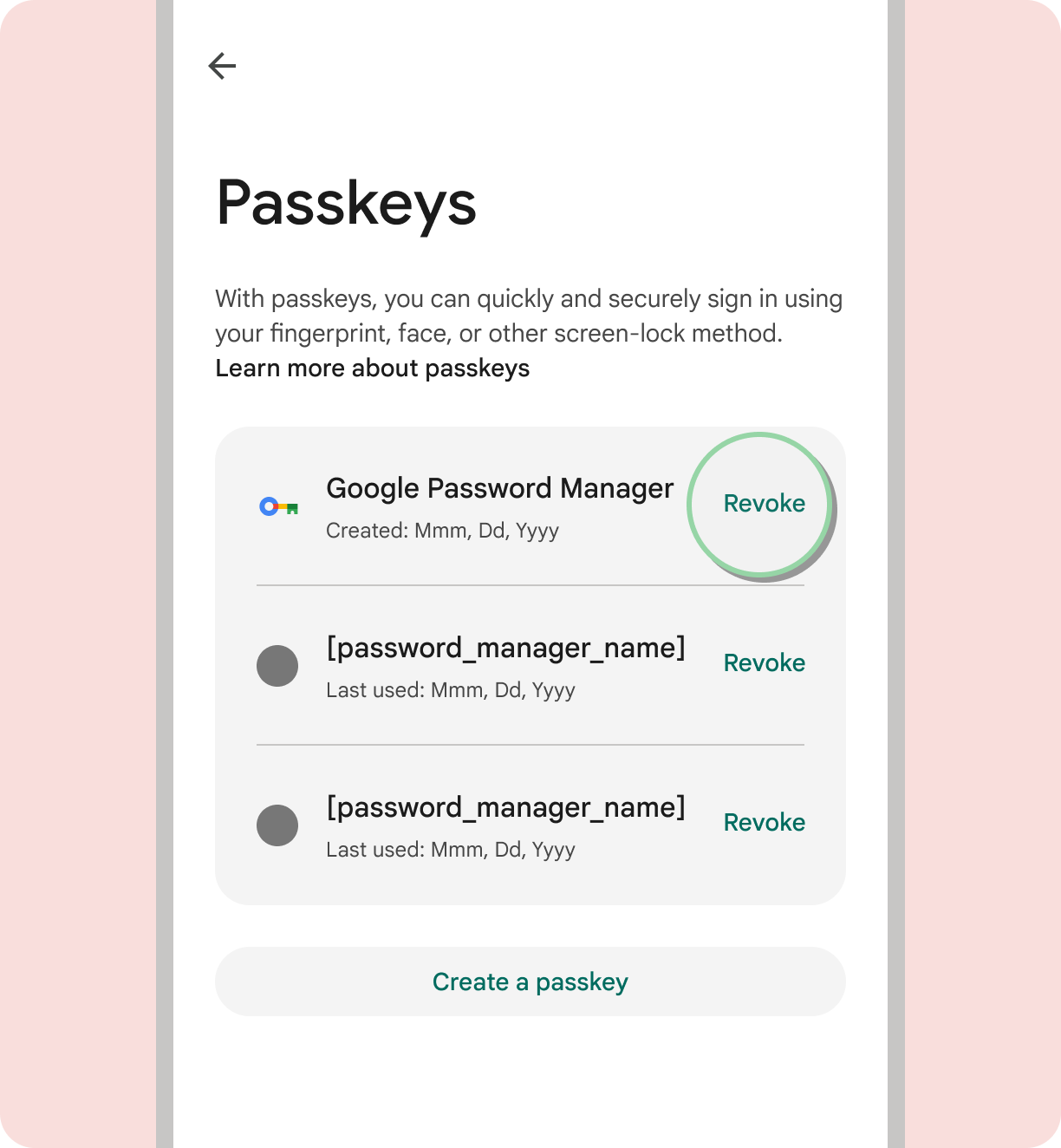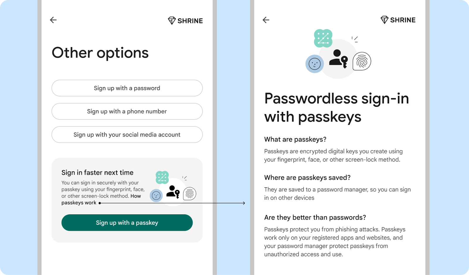पासकी, Google की इन सेवाओं के लिए ज़्यादा सुरक्षित और आसान हैं पासवर्ड. पासकी की मदद से, उपयोगकर्ता अपने डिवाइस में पहले से मौजूद पुष्टि करने की सुविधाओं का इस्तेमाल करके, ऐप्लिकेशन और वेबसाइटों में साइन इन कर सकते हैं. जैसे, फ़िंगरप्रिंट, चेहरे की पहचान, पिन या पैटर्न. इससे, उपयोगकर्ताओं को आसानी से साइन इन करने का अनुभव मिलता है. साथ ही, उन्हें पासवर्ड याद रखने की ज़रूरत नहीं पड़ती.