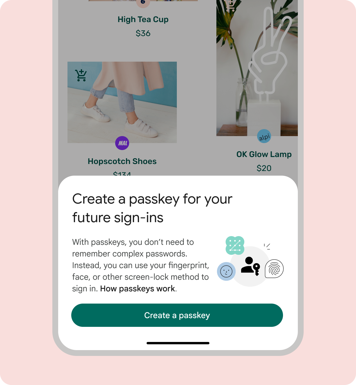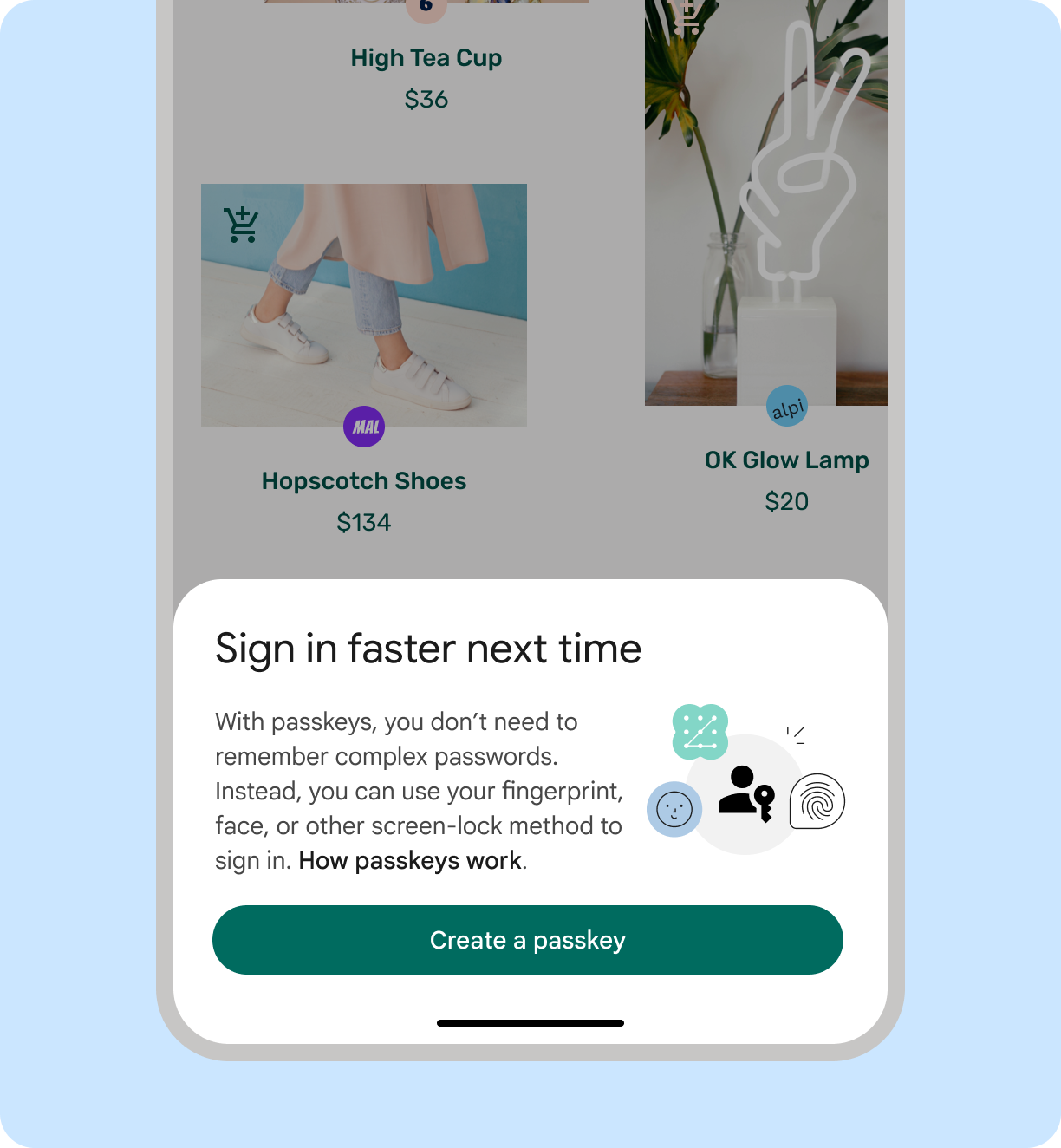 • Android पर साइन इन करने का एक जैसा अनुभव देने के लिए, Google के दिए गए पासकी आइकॉन का इस्तेमाल करें