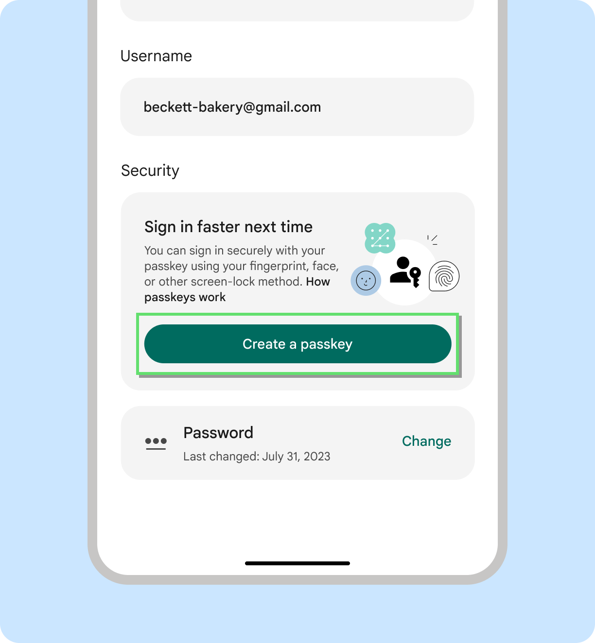 पासवर्ड या साइन-इन करने के अन्य तरीकों का इस्तेमाल करने वाले मौजूदा खातों के लिए, पासकी दिखाएं खाता सेटिंग में प्रॉम्प्ट सबमिट करें. इससे उपयोगकर्ताओं को पासकी पर अपग्रेड करने में मदद मिलेगी. पक्का करें कि उपयोगकर्ता एक ही उपयोगकर्ता नाम के लिए, एक ही उपयोगकर्ता नाम के लिए डुप्लीकेट पासकी नहीं बना रहा हो पासवर्ड मैनेजर.