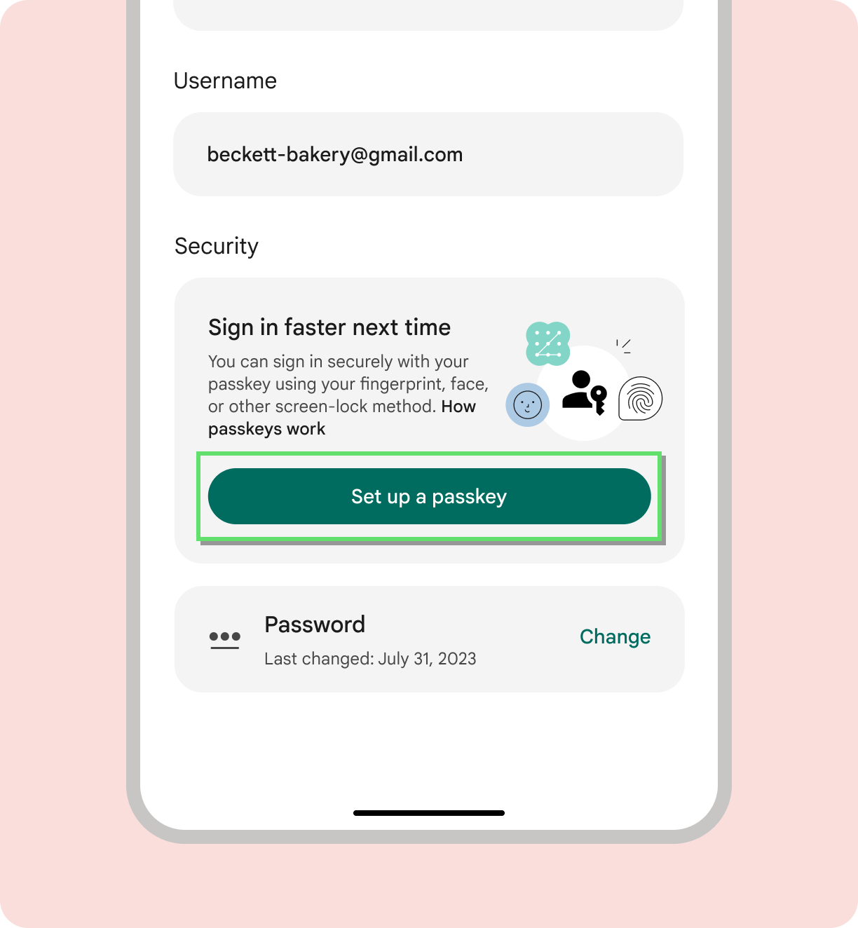 • मौजूदा उपयोगकर्ता: खाता वापस पाने के दौरान, पासवर्ड से साइन इन करने के बाद, और खाते की सेटिंग में पासकी बनाने का प्रमोशन करें. ऐसा तब करें, जब उपयोगकर्ता पहले से ही खाते को मैनेज करने के बारे में सोच रहे हों