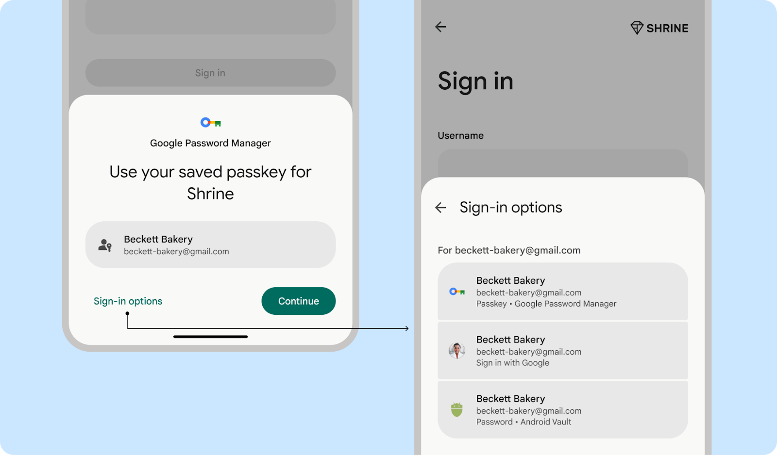 • अगर उपयोगकर्ता के पास एक से ज़्यादा खाते हैं, तो वह सबसे पहले अपना पसंदीदा खाता चुनता है. इसके बाद, पासकी से साइन इन करने के लिए, स्क्रीन लॉक का इस्तेमाल करता है.