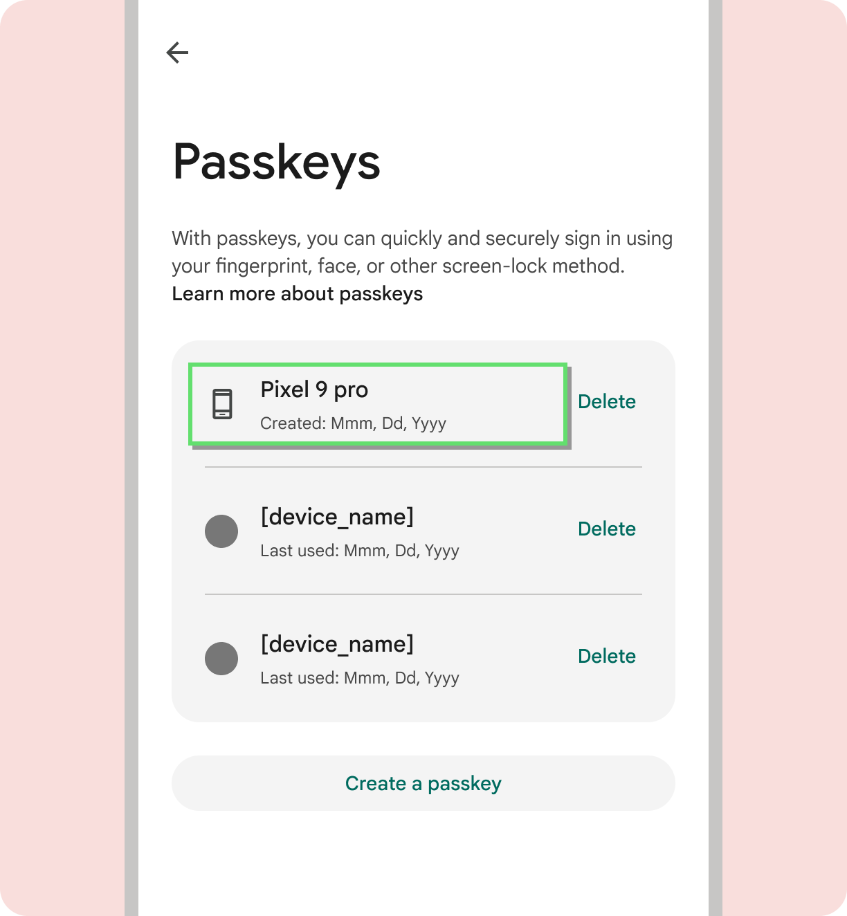 पासकी, जानी-पहचानी गतिविधियों के लिए इस्तेमाल की जाने वाली एक ऐडवांस टेक्नोलॉजी है. "पासकी" के बारे में बताते समय, उपयोगकर्ताओं को बताएं कि वे अपने डिवाइस को अनलॉक करने के तरीके से ही, स्क्रीन लॉक का इस्तेमाल करके सुरक्षित तरीके से साइन इन कर सकते हैं. जैसे, फ़िंगरप्रिंट, फ़ेस, पिन या किसी अन्य तरीके से.