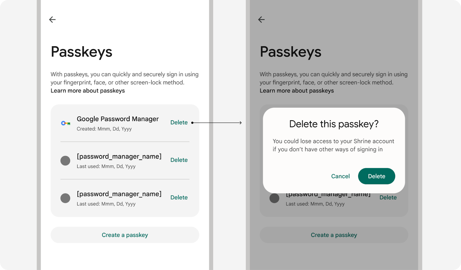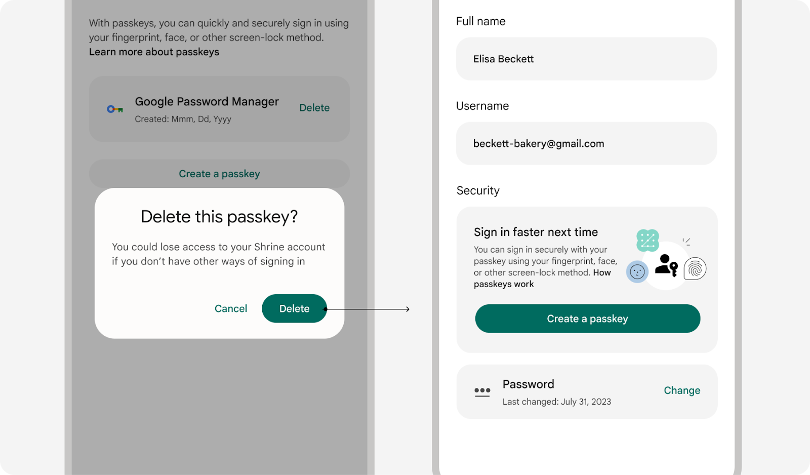पासकी को पूरी तरह से मिटाने के लिए, उपयोगकर्ता को आपके प्रॉडक्ट पर पासकी मिटानी पड़ सकती है. इसके बाद, उसे अपने पासवर्ड मैनेजर से भी पासकी मिटानी पड़ सकती है. हालांकि, दोनों में से किसी भी जगह पर पासकी मिटाने के बाद, वह काम नहीं करेगी.