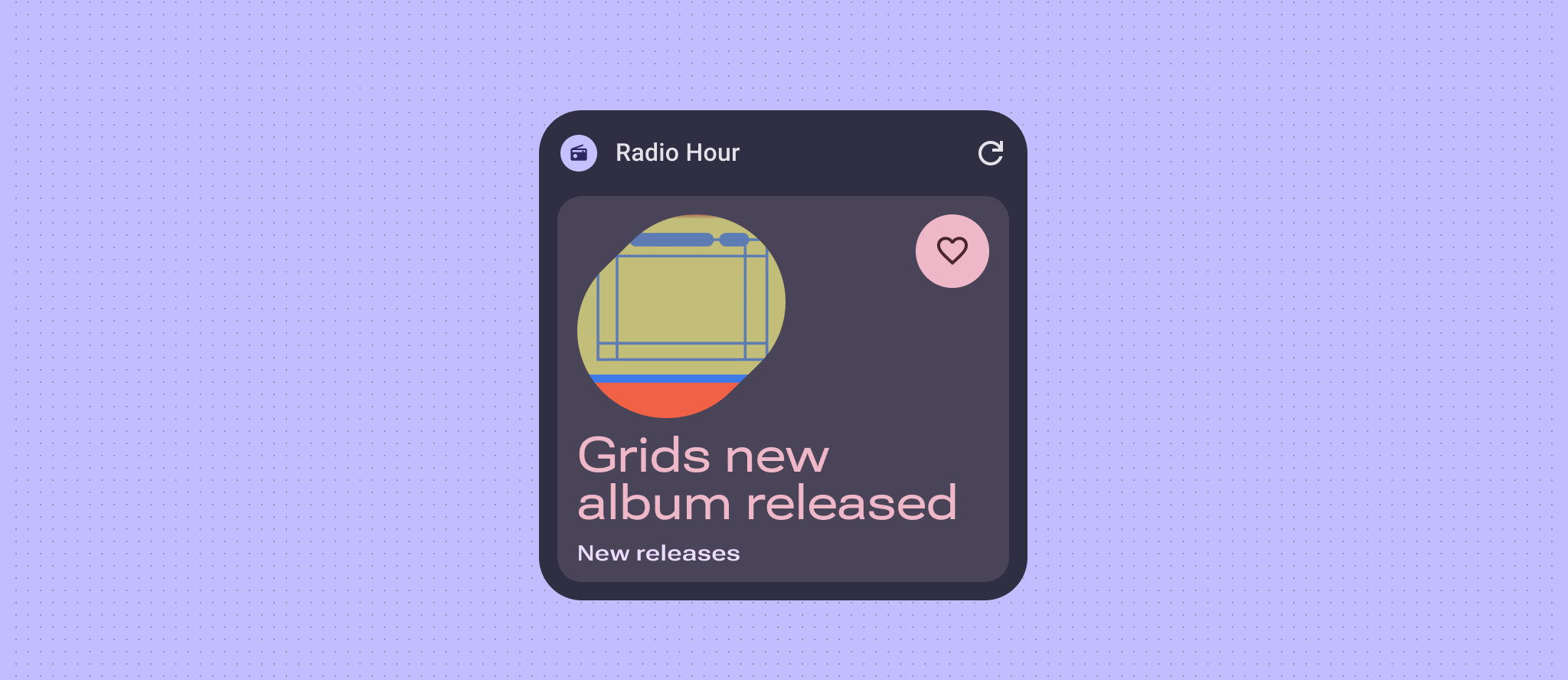 Si tu widget muestra contenido de datos mínimo, como una foto, el clima o la reproducción de la canción actual, intenta hacer que todo el widget tenga una forma expresiva para brindar una emocionante explosión de energía a la pantalla principal del usuario. Si tienes diseños y datos más complejos, considera usar formas expresivas para la jerarquía visual, destacar contenido nuevo o una llamada a la acción.