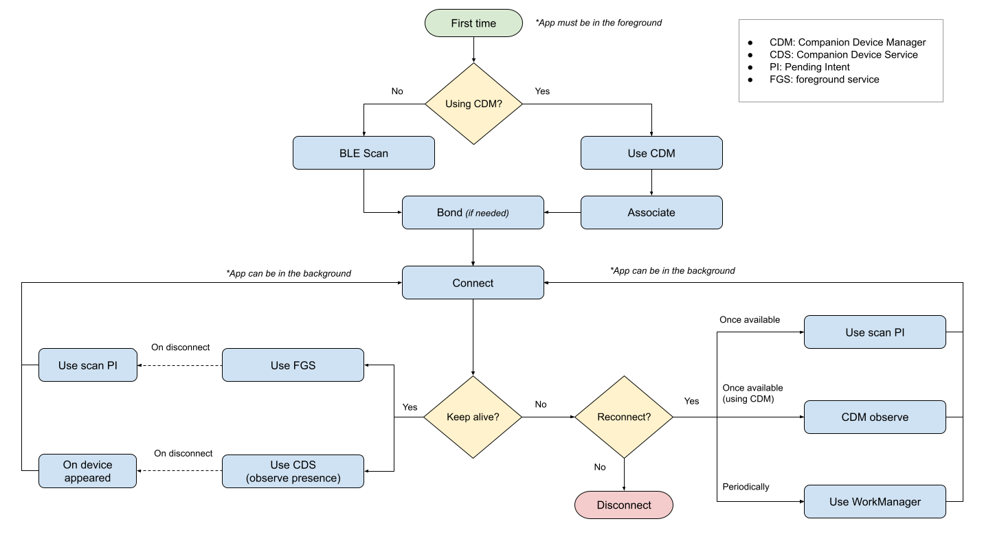 การเชื่อมต่อกับอุปกรณ์ขณะที่แอปทำงานอยู่เบื้องหลังนั้นไม่มีข้อจำกัด แม้ว่าการเชื่อมต่อจะปิดลงหากกระบวนการถูกยกเลิกก็ตาม นอกจากนี้ ยังมีข้อจํากัดในการเริ่มกิจกรรม (ใน Android 10 ขึ้นไป) หรือบริการที่ทำงานอยู่เบื้องหน้า (ใน Android 12 ขึ้นไป) จากเบื้องหลัง