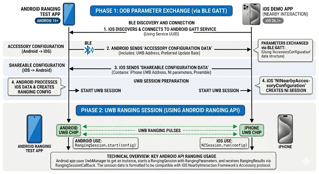범위 지정 모듈은 초광대역 (UWB)을 사용하여 iOS 기기와의 상호 운용성을 지원합니다. iOS 기기로 범위를 지정하려면 맞춤 OOB 구현을 사용하고 Apple Nearby Interaction Accessory Protocol과 일치하는 특정 매개변수로 범위 지정 세션을 구성해야 합니다. 참고용 샘플 앱을 참고하세요.