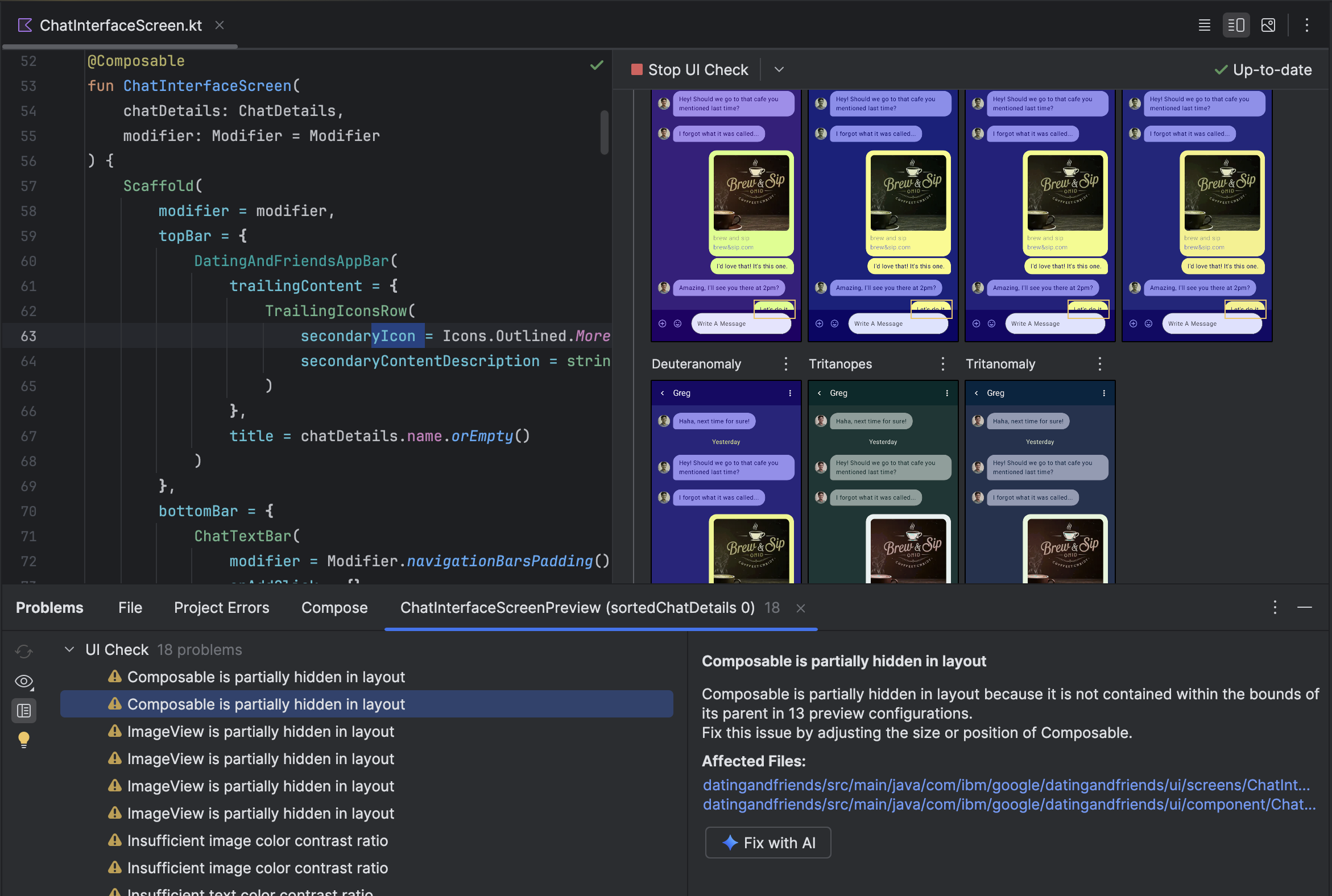 Compose プレビューで Compose UI チェックモードを有効にすると、Android Studio は Compose UI を自動的に監査し、UI のユーザー補助と適応性を高めるための改善点を提案します。Android Studio は、さまざまな画面サイズで UI が動作することを確認します。[問題] パネルに、検出された問題(大画面でテキストが引き伸ばされている、色のコントラストが低いなど)が表示されます。