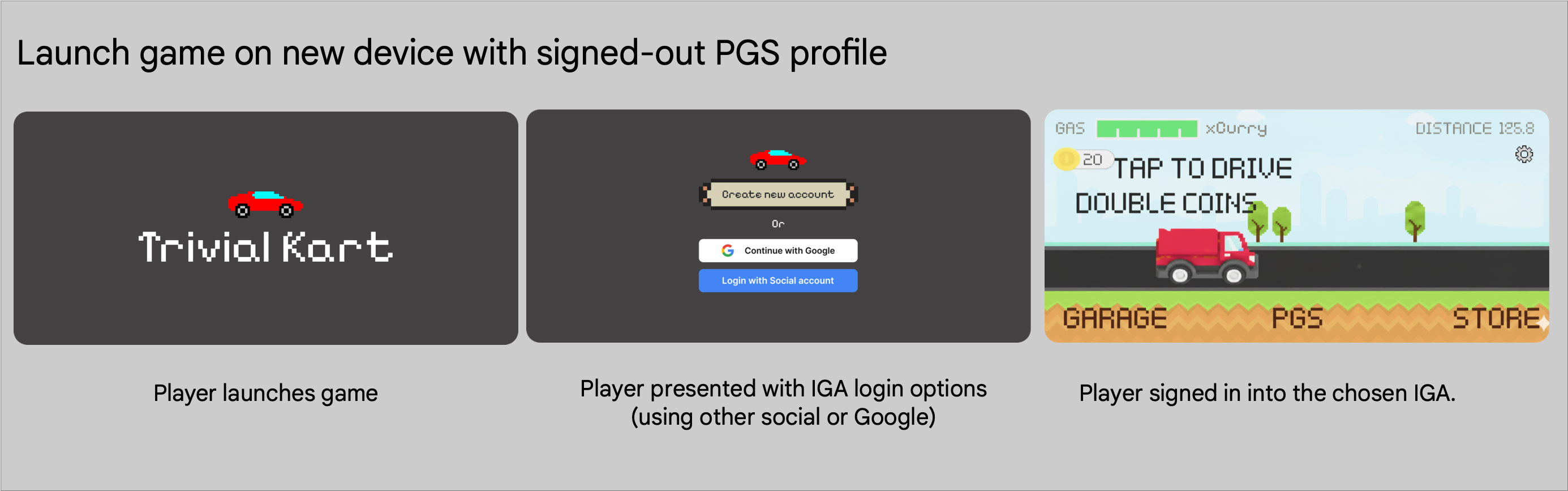 플레이어는 로컬 게스트 계정을 사용하여 게임을 실행하고 플레이할 수 있습니다. PGS는 백그라운드에서 계속 인증합니다. 플레이어가 진행 상황 저장을 선택하면 게임에서 게스트 세션을 영구 IGA로 변환하고 이를 PGS 플레이어 ID에 바인딩합니다.