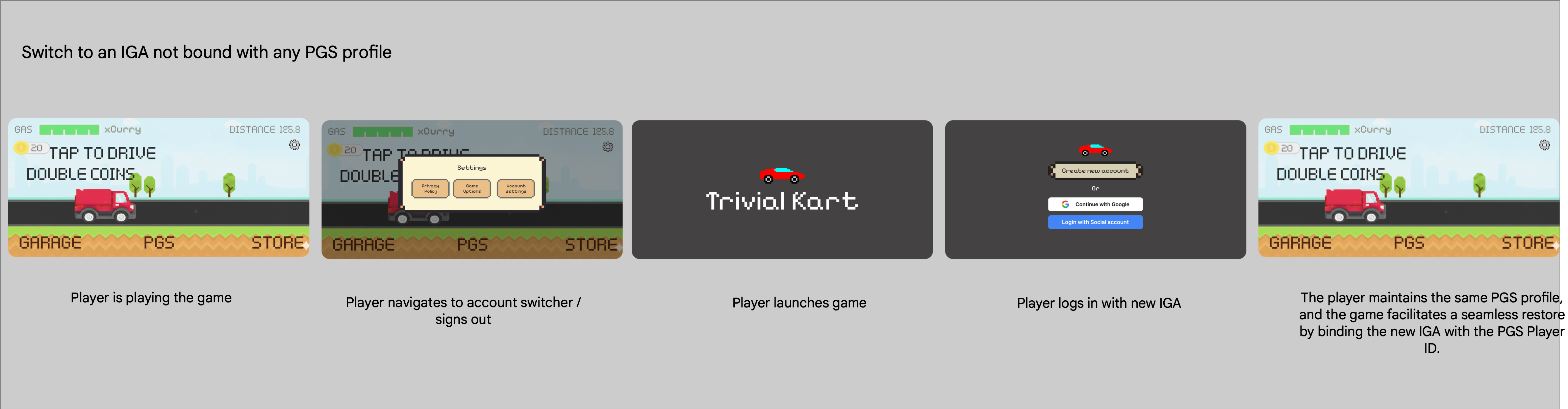 2. Khi người chơi đăng nhập bằng một IGA khác, trò chơi sẽ liên kết tài khoản mới này với Mã nhận dạng người chơi hiện tại trên PGS dưới dạng IGA được chơi gần đây nhất chỉ để khôi phục liền mạch.