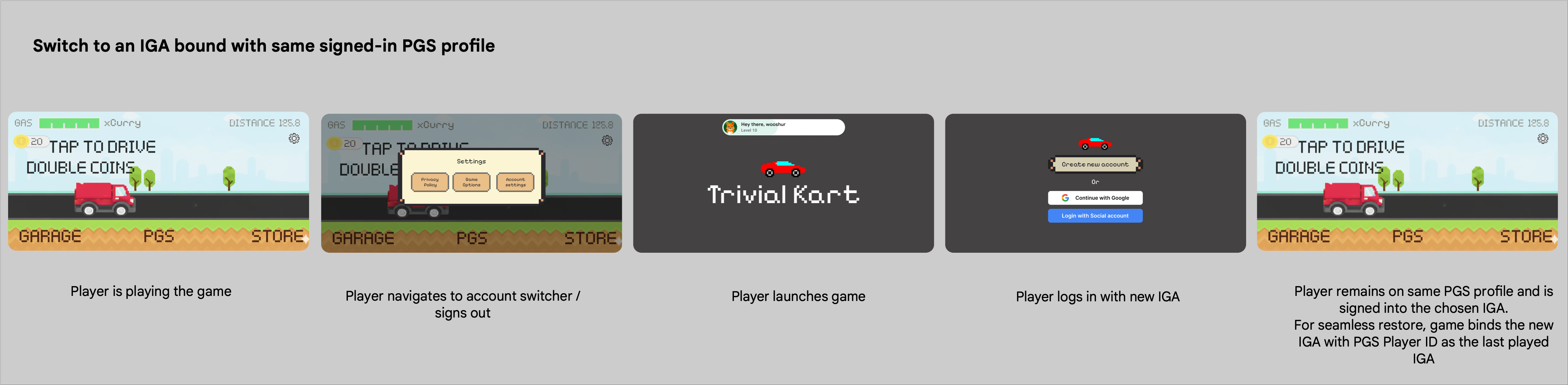 • Quản lý nhiều IGA: Dịch vụ trò chơi của Play chỉ xử lý quy trình xác thực nền tảng. Trò chơi của bạn quản lý quy trình xác thực chính của người chơi vào IGA. Điều này có nghĩa là không có thay đổi nào đối với các quy trình hiện có của trò chơi để người chơi chuyển đổi giữa các IGA. Khi người chơi chuyển đổi tài khoản, họ vẫn được xác thực với nền tảng Play Games thông qua PGS và bạn tiếp tục gửi dữ liệu của họ liên quan đến thành tích và các tính năng khác của PGS dựa trên Mã nhận dạng người chơi liên tục.