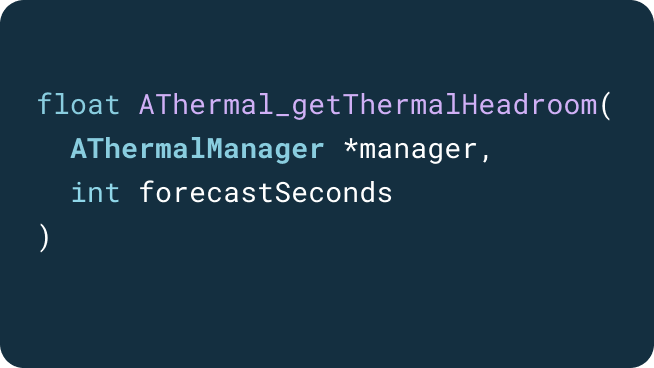 Sehen Sie sich eine Beispiel-App an, die mithilfe der getThermalHeadroom API und der Thermal State Monitoring API den Temperaturstatus des Geräts anzeigt. Die Anwendung ändert außerdem die Arbeitslast basierend auf dem API-Hinweis dynamisch und verwendet die PerformanceHintManager API, um die Leistung des Rendering-Threads zu steuern.