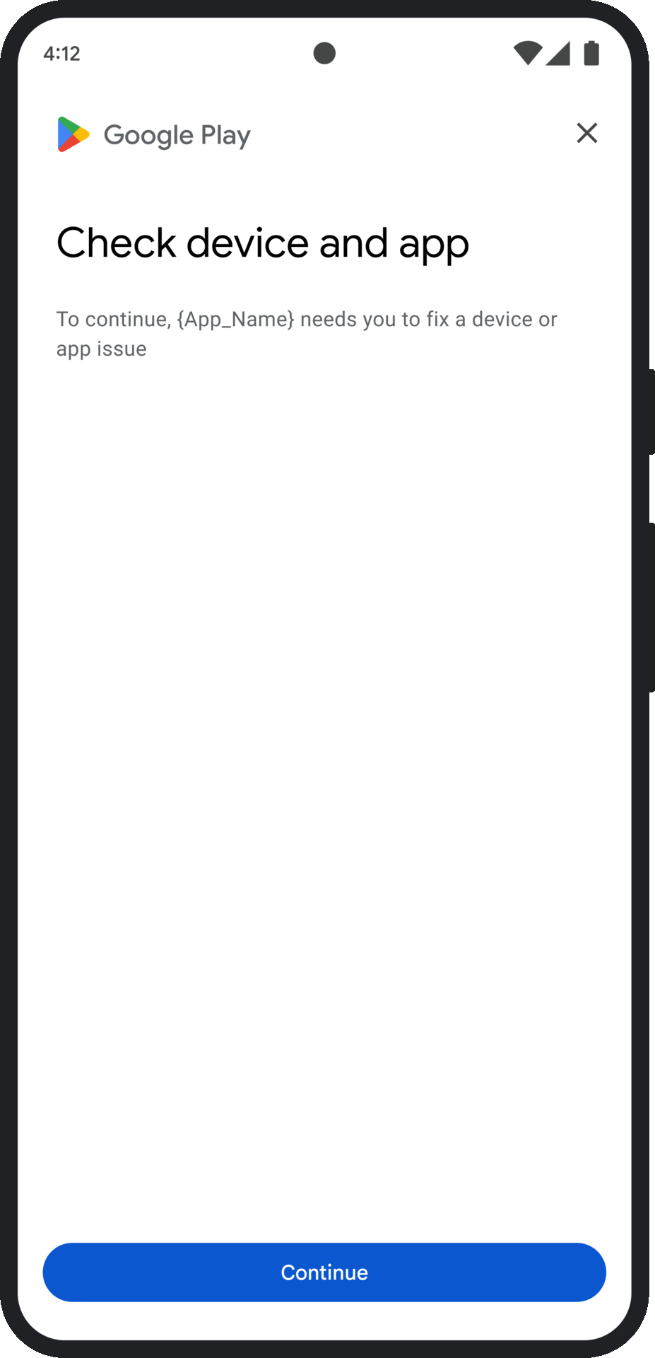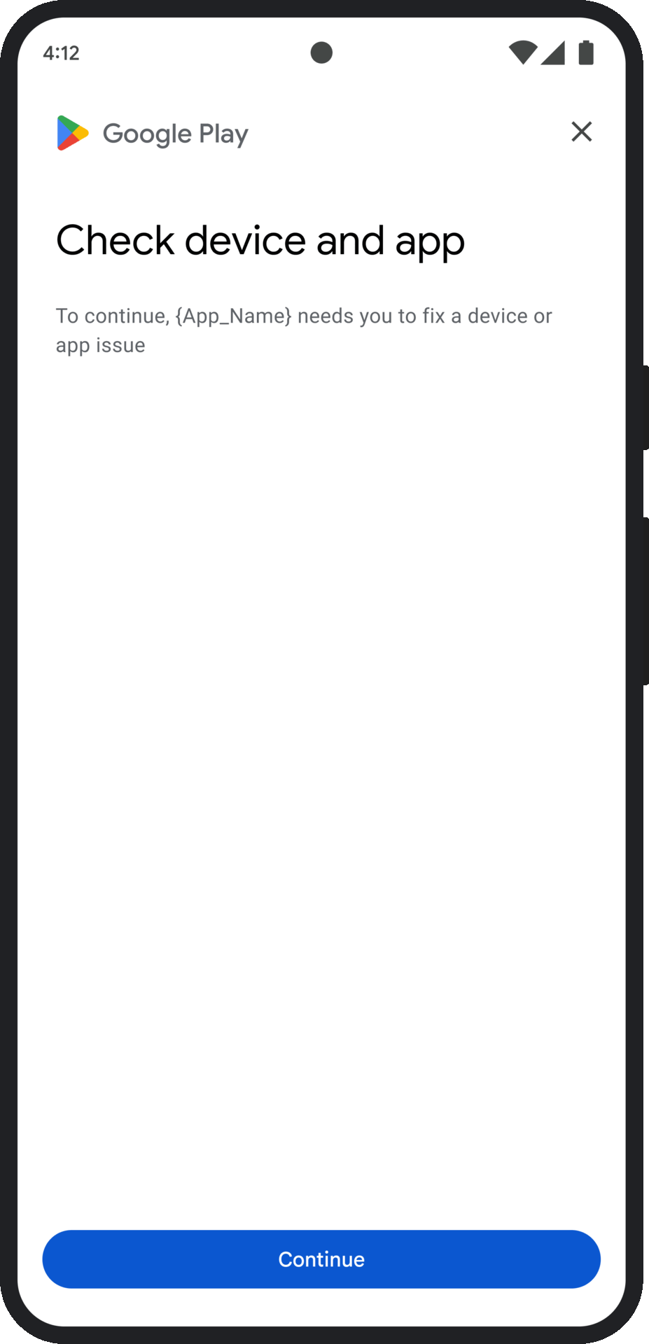 - क्लाइंट-साइड अपवाद: यह डायलॉग, Integrity API से जुड़ी किसी भी समस्या की जांच करता है और उसे ठीक करने की कोशिश करता है. उदाहरण के लिए, यह उपयोगकर्ता को Google Play services के पुराने वर्शन को अपडेट करने के लिए कह सकता है.