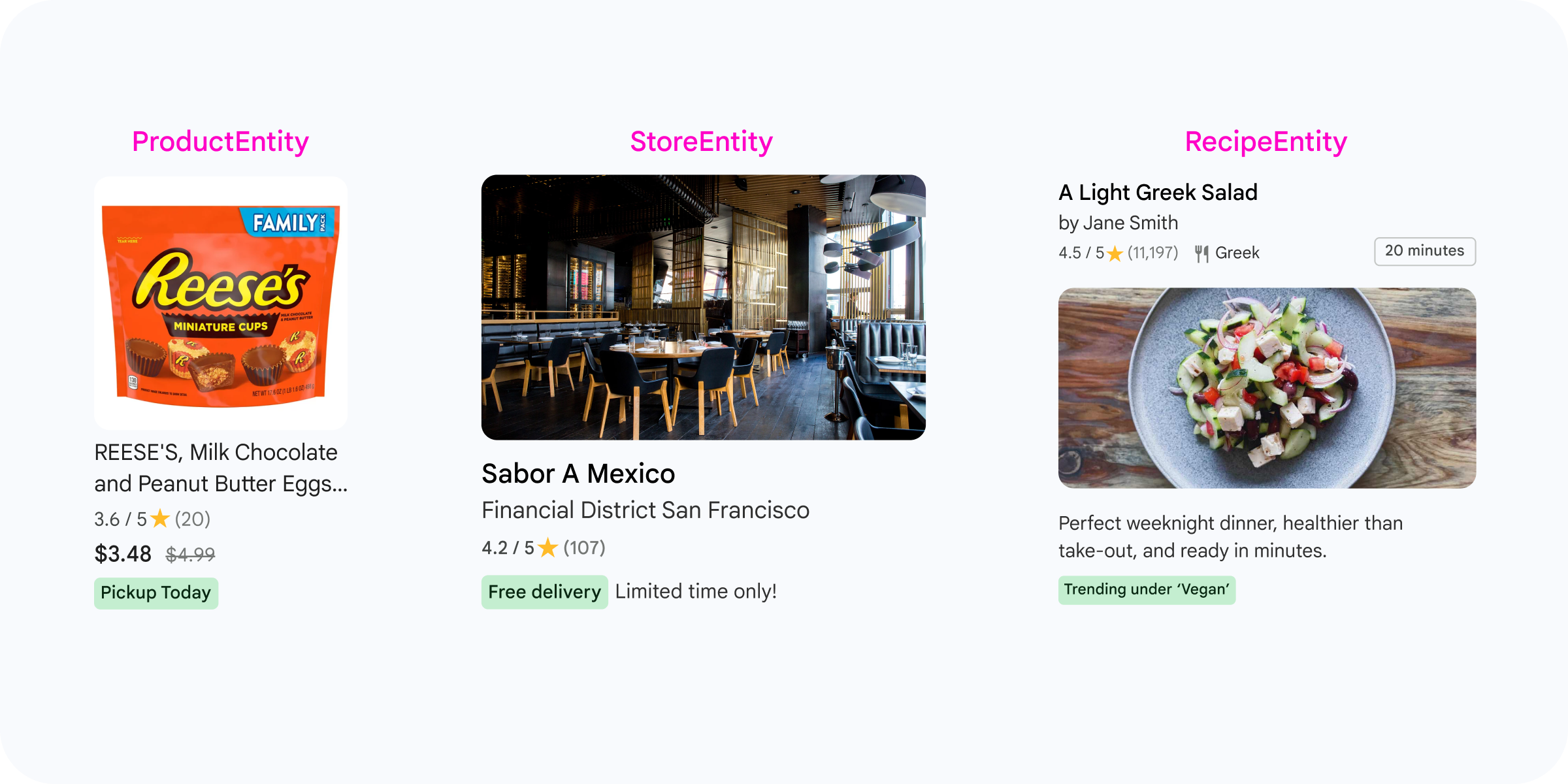 המדריך הזה מכיל הוראות לשותפי פיתוח להצגת תוכן שקשור לאוכל (הזמנת אוכל, ביקורות על אוכל או מסעדות, חיפוש אוכל או מסעדות, מינויים לארוחות, מתכונים) בממשקי תוכן של Engage.