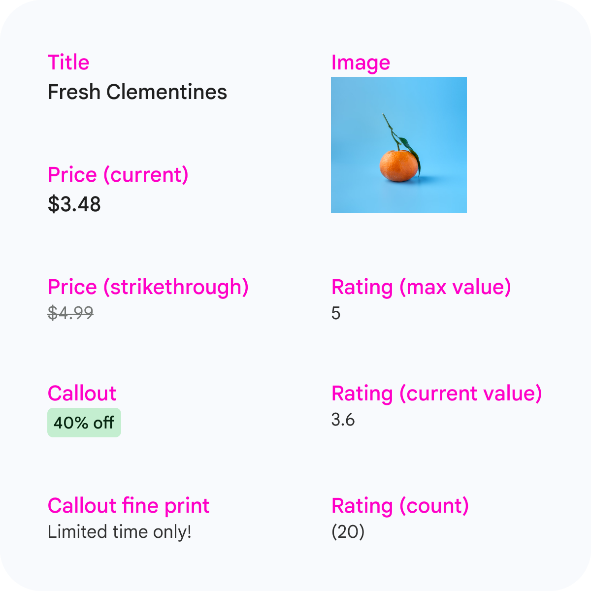 | דירוג – ספירה | אופציונלי | מספר הדירוגים של המוצר. הערה: צריך לספק את השדה הזה אם האפליקציה שולטת באופן שבו המספר מוצג למשתמשים. משתמשים במחרוזת תמציתית. לדוגמה, אם המספר הוא 1,000,000, כדאי להשתמש בקיצור כמו 1M כדי שהמספר לא ייחתך בגדלי מסך קטנים יותר. |