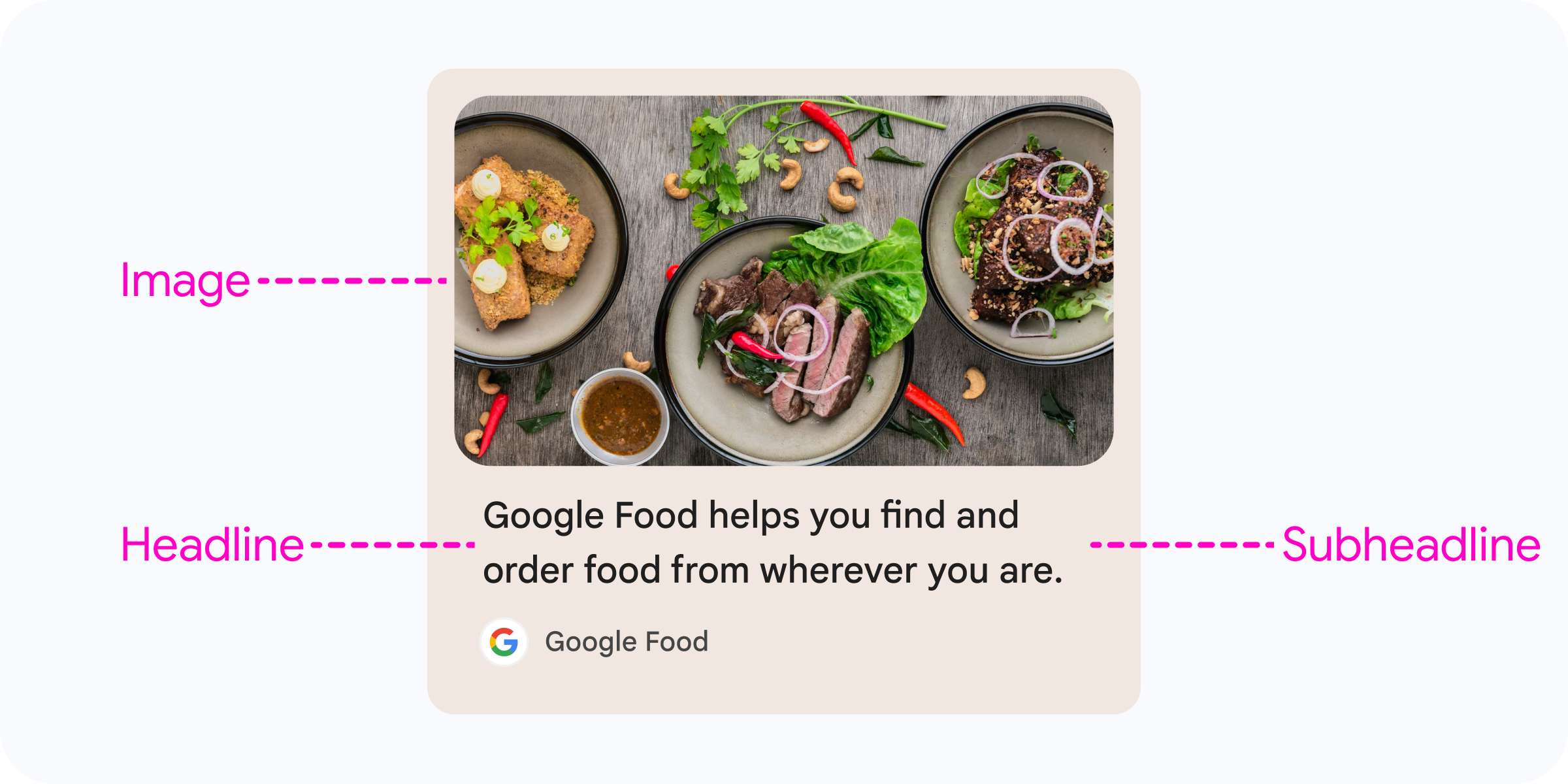 | कॉलआउट | वैकल्पिक | अगर उपलब्ध हो, तो रेसिपी के लिए प्रमोशन, इवेंट या अपडेट दिखाने वाला कॉलआउट. | फ़्री टेक्स्ट सुझाया गया टेक्स्ट साइज़: 45 वर्णों से कम (बहुत लंबा टेक्स्ट होने पर, एलिप्सिस दिख सकते हैं) |