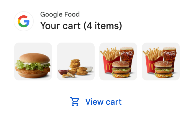 फ़ूड शॉपिंग कार्ट क्लस्टर में, कार्ट में मौजूद आइटम की कुल संख्या दिखनी चाहिए. इसमें उपयोगकर्ता के कार्ट में मौजूद X आइटम की इमेज भी शामिल हो सकती हैं.