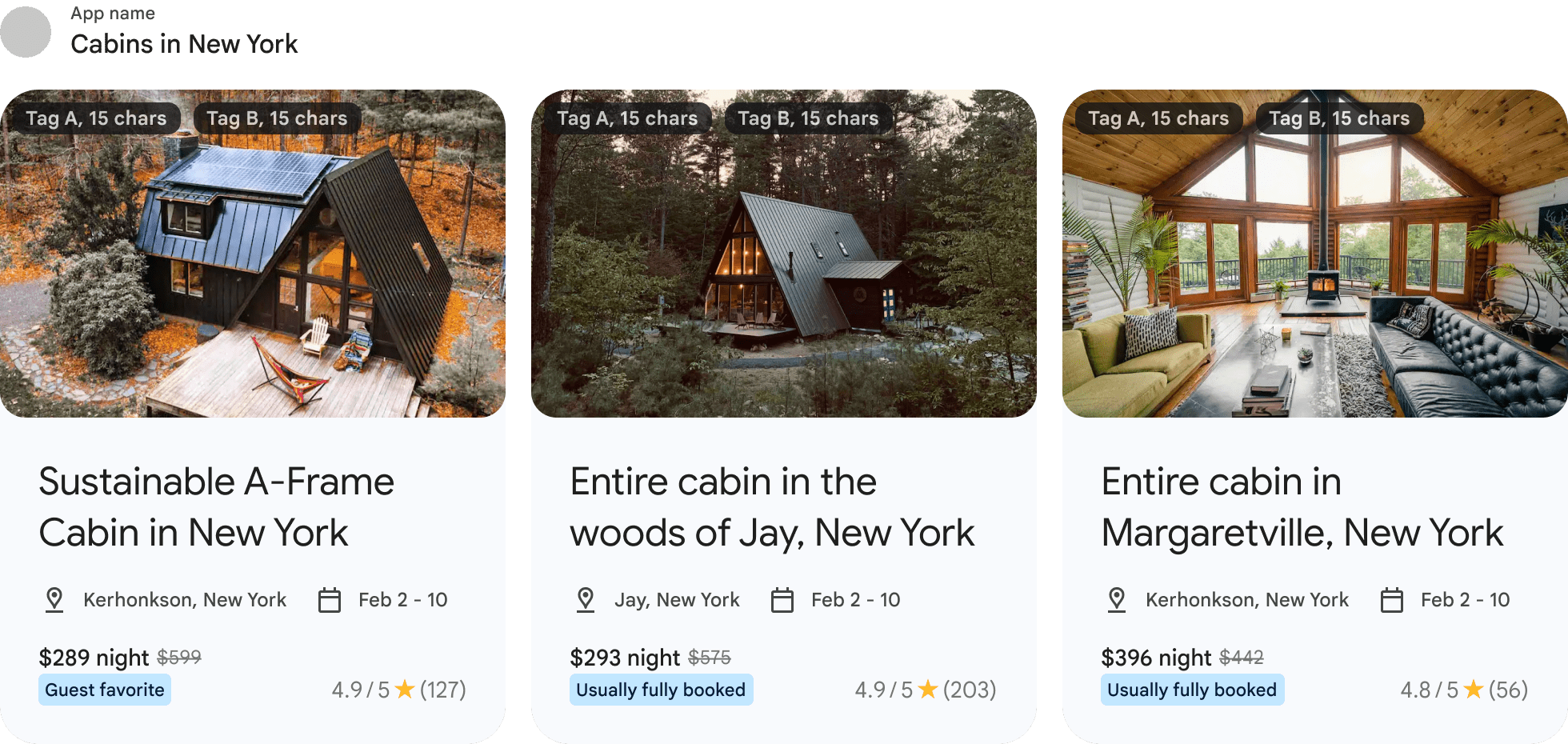באשכולות המלצות מוצגות הצעות מותאמות אישית לנסיעות ולאירועים ממפתחים שותפים. ההמלצות האלה יכולות להיות מותאמות אישית למשתמש או כלליות (למשל, פריטים פופולריים). הם משמשים להצגת המלצות למאמרים, לאירועים, למקומות לינה או למקומות מעניינים.