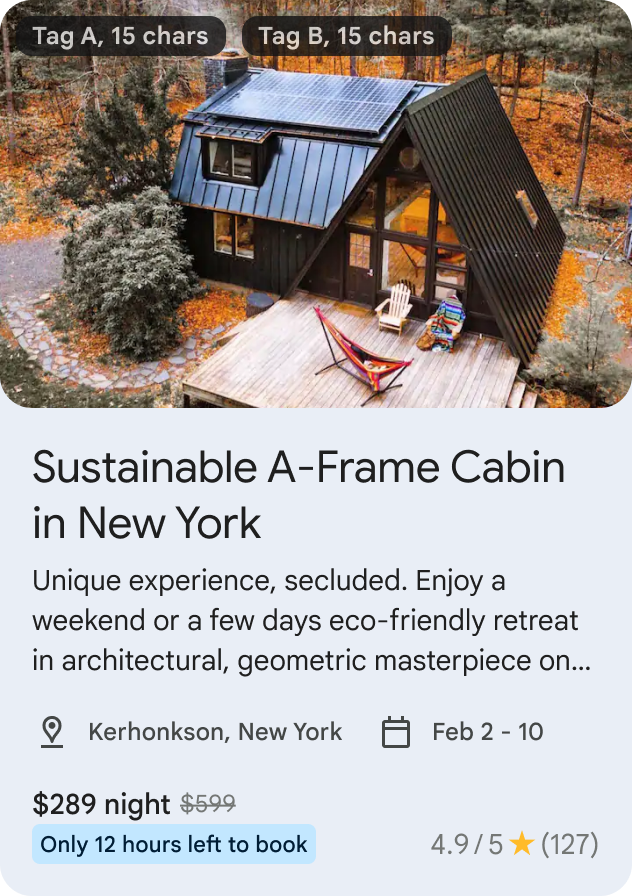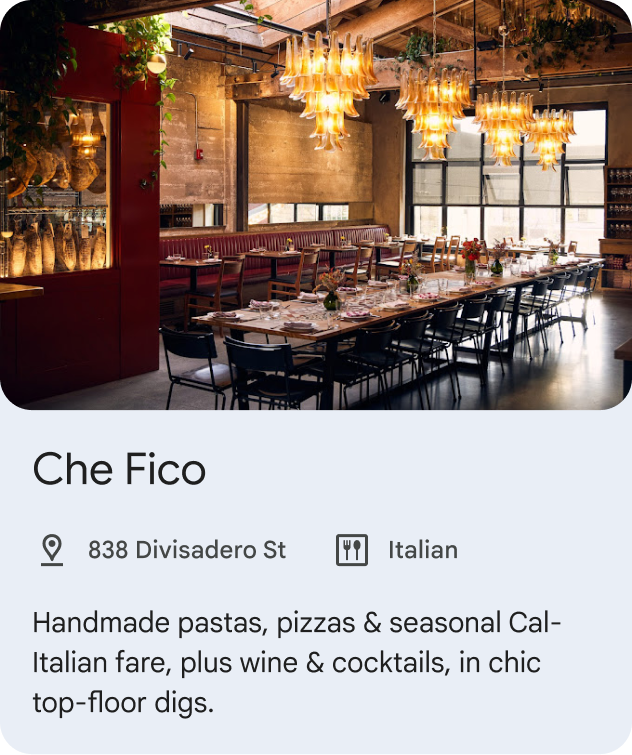 איור 3: ממשק משתמש שבו מוצג LodgingEntity יחיד באוסף ההמלצות. StoreEntity: StoreEntity מייצג חנות, מסעדה, בית קפה וכו'. הוא מדגיש תוכן שבו מקום לאכילה או חנות הם פריט המידע החשוב שצריך להעביר למשתמשים.