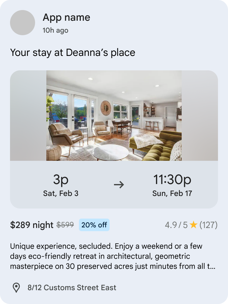 המטרה העיקרית של כוונות שידור היא הפעלה מחדש של אפליקציות וכפייה של סנכרון נתונים. ה-Intents של שידור לא נועדו להישלח בתדירות גבוהה מאוד. ההתראה מופעלת רק כשהשירות של Engage קובע שהתוכן עשוי להיות לא עדכני (לדוגמה, אם הוא נוצר לפני שבוע). כך המשתמשים יכולים להיות בטוחים שהם יקבלו חוויית תוכן עדכנית, גם אם האפליקציה לא הופעלה במשך תקופה ארוכה.