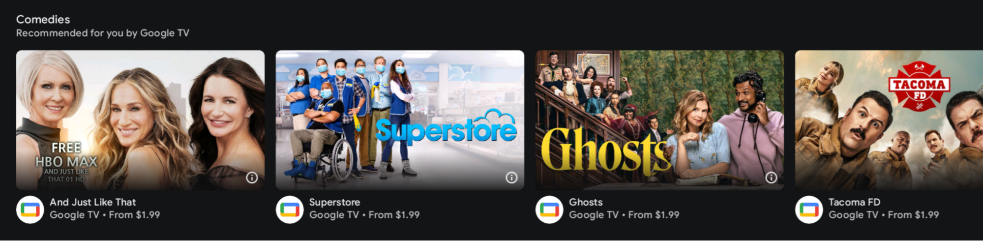 Рисунок 1. Пользовательский интерфейс Entertainment Space, отображающий кластер рекомендаций от одного партнера. Сущность: объект, представляющий отдельный элемент в кластере. Сущностью может быть фильм, телешоу, сериал, прямая трансляция и многое другое. Список поддерживаемых типов сущностей см. в разделе «Предоставление данных сущности» .