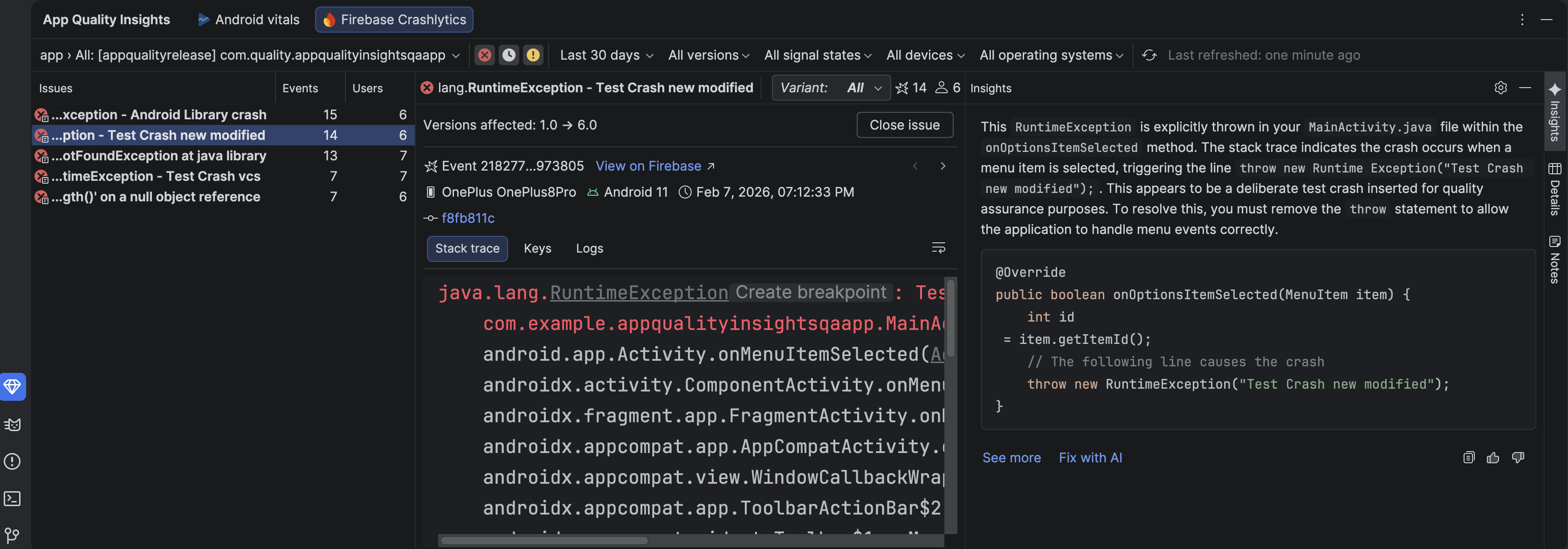 ऐप्लिकेशन की क्वालिटी के बारे में अहम जानकारी देने वाला टूल अब एआई एजेंट के साथ इंटिग्रेट हो गया है. इससे क्रैश डेटा और आपके सोर्स कोड का विश्लेषण किया जा सकेगा. साथ ही, क्रैश की वजहों के बारे में पूरी जानकारी दी जा सकेगी और उन्हें ठीक करने के सुझाव दिए जा सकेंगे. App Quality Insights टूल विंडो में क्रैश चुनने के बाद, इनसाइट टैब पर जाएं. इसके बाद, क्रैश के बारे में ज़्यादा जानकारी देखने के लिए, ज़्यादा देखें पर क्लिक करें. एजेंट से कोड में बदलावों के सुझाव पाने के लिए, एआई की मदद से ठीक करें पर क्लिक करें. इन सुझावों की समीक्षा करके, उन्हें स्वीकार किया जा सकता है.