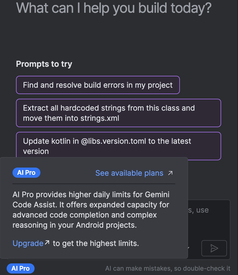 Android Studio Panda 4 Canary 2 では、Google One AI Pro プランまたは Ultra プランに登録すると、エージェント モード の機能が強化されます。Google One との統合により、デフォルトの Gemini モデルのレート上限の引き上げと コンテキスト ウィンドウの拡大により、Android 開発が大幅に強化されます。Google One AI Pro プランまたは Ultra プランに登録している場合は、Android Studio で Google アカウントにログインすると、これらの特典を自動的に利用できます。