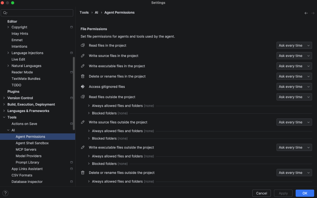 Bạn có thể kiểm tra các quyền theo cách thủ công tại File > Settings > Tools > AI > Agent Permissions (Tệp > Cài đặt > Công cụ > AI > Quyền của tác nhân) (hoặc Android Studio > Settings > Tools > AI > Agent Permissions (Android Studio > Cài đặt > Công cụ > AI > Quyền của tác nhân) trên macOS).