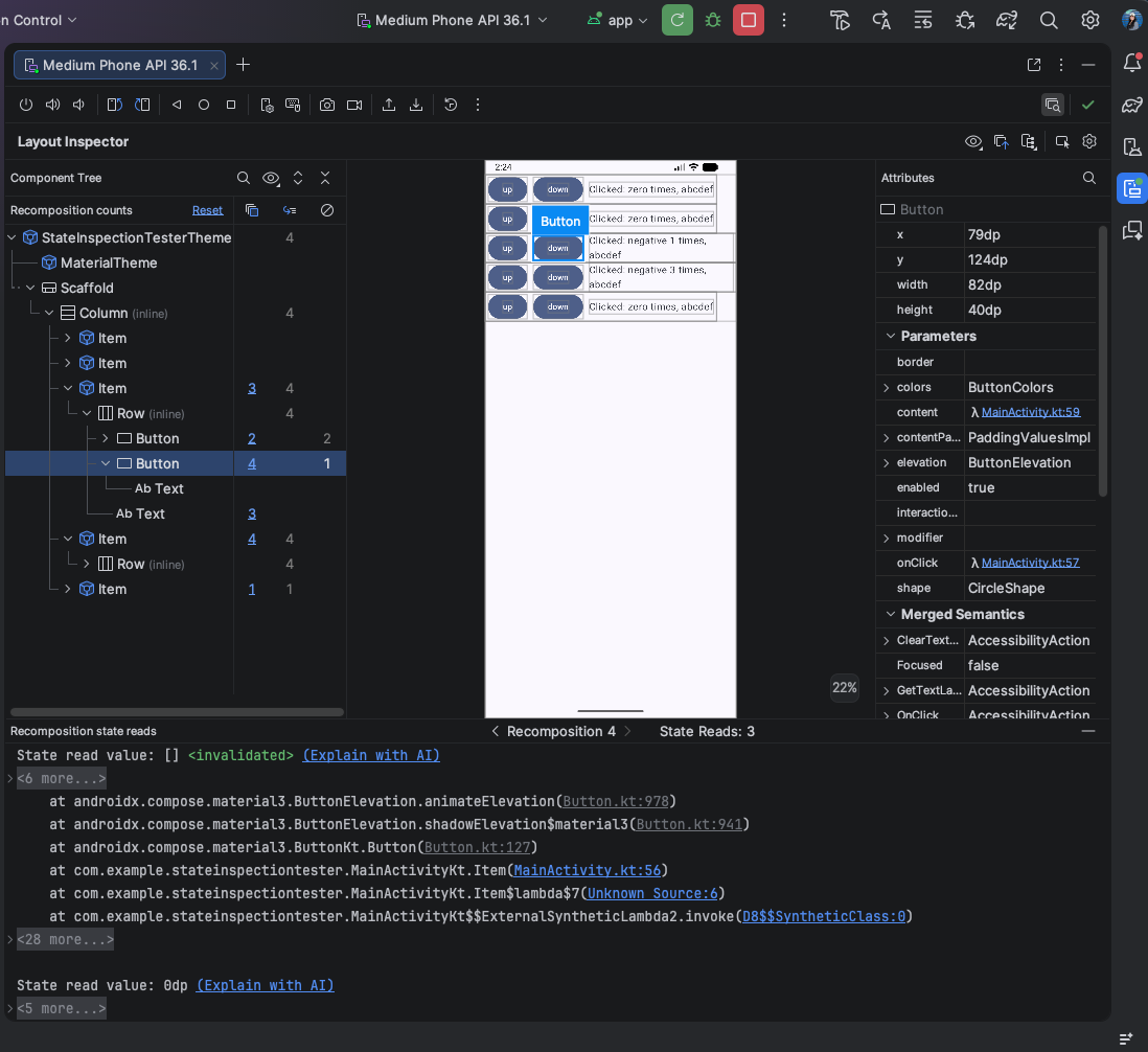 हमने लेआउट इंस्पेक्टर में, रीकंपोज़िशन की स्थिति को पढ़ने की सुविधा जोड़ी है. इससे, रीकंपोज़िशन की ज़्यादा संख्या का पता लगाना आसान हो गया है. यह सुविधा, Panda 3 canary में उपलब्ध है. इससे आपको उन स्टेट वैरिएबल की पहचान करने में मदद मिलती है जिन्होंने रीकंपोज़िशन को ट्रिगर किया है. इसके लिए, यह सुविधा उस साइकल के दौरान किए गए स्टेट रीड की पूरी सूची उपलब्ध कराती है. इस सुविधा का इस्तेमाल करने के लिए, compose.ui:ui:1.10.0 (BOM 2025.12.01) या इसके बाद के वर्शन का इस्तेमाल करें.