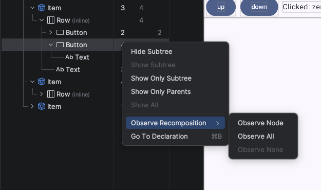 Включите чтение состояния перекомпозиции в инспекторе компоновки. Взаимодействуйте со своим приложением. При перекомпоновке нажмите на синие ссылки с подсчетом в дереве компонентов, чтобы проверить состояние.