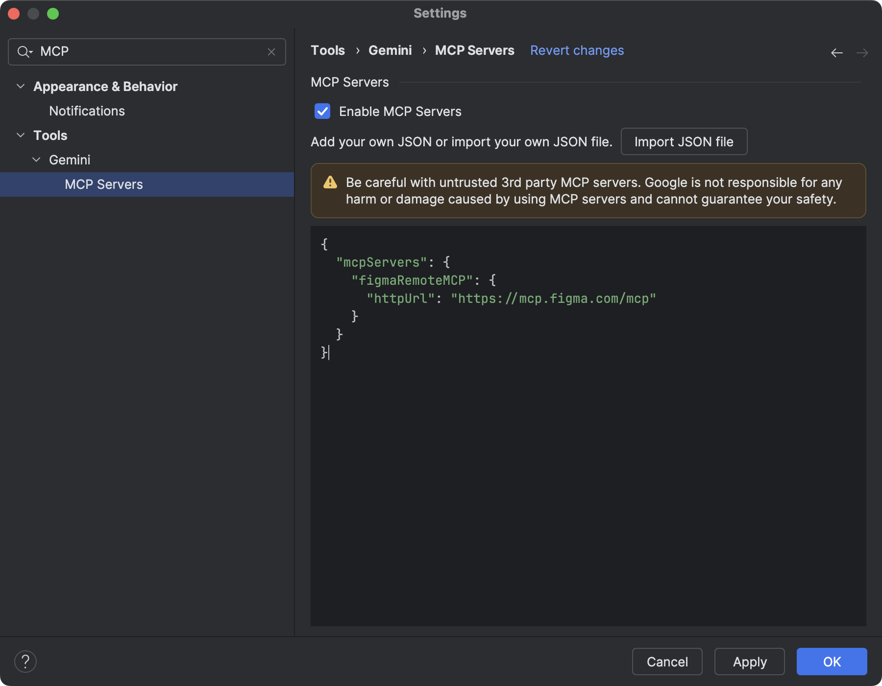 ตั้งแต่ Android Studio Otter 1 Canary 3 เป็นต้นไป คุณจะเชื่อมต่อกับเซิร์ฟเวอร์ MCP ระยะไกลได้โดยใช้ Android Studio เมื่อใช้เซิร์ฟเวอร์ MCP ระยะไกล เอเจนต์ Gemini ใน Android Studio จะเข้าถึงเครื่องมือและทรัพยากรภายนอกได้ และคุณก็ไม่ต้อง ติดตั้งและบำรุงรักษาเซิร์ฟเวอร์ด้วยตนเองมากนัก เช่น คุณ สามารถเชื่อมต่อกับเซิร์ฟเวอร์ MCP ระยะไกลของ Figma เพื่อเชื่อมต่อกับไฟล์ Figma โดยไม่ต้อง ติดตั้งแอปเดสก์ท็อปของ Figma ดูข้อมูลเพิ่มเติมเกี่ยวกับวิธีเพิ่มเซิร์ฟเวอร์ MCP ได้ที่เพิ่มเซิร์ฟเวอร์ MCP