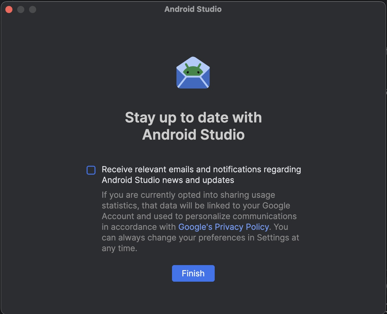 Android Studio Otter 1 Canary 3 ขึ้นไปมีตัวเลือกใหม่ให้เลือกรับ การสื่อสารจากทีมของเรา ซึ่งจะช่วยให้คุณได้รับอีเมล และการแจ้งเตือนที่เกี่ยวข้องเกี่ยวกับข้อมูลอัปเดตและฟีเจอร์ใหม่ใน Android Studio คุณจะเห็นตัวเลือกนี้เมื่อลงชื่อเข้าใช้