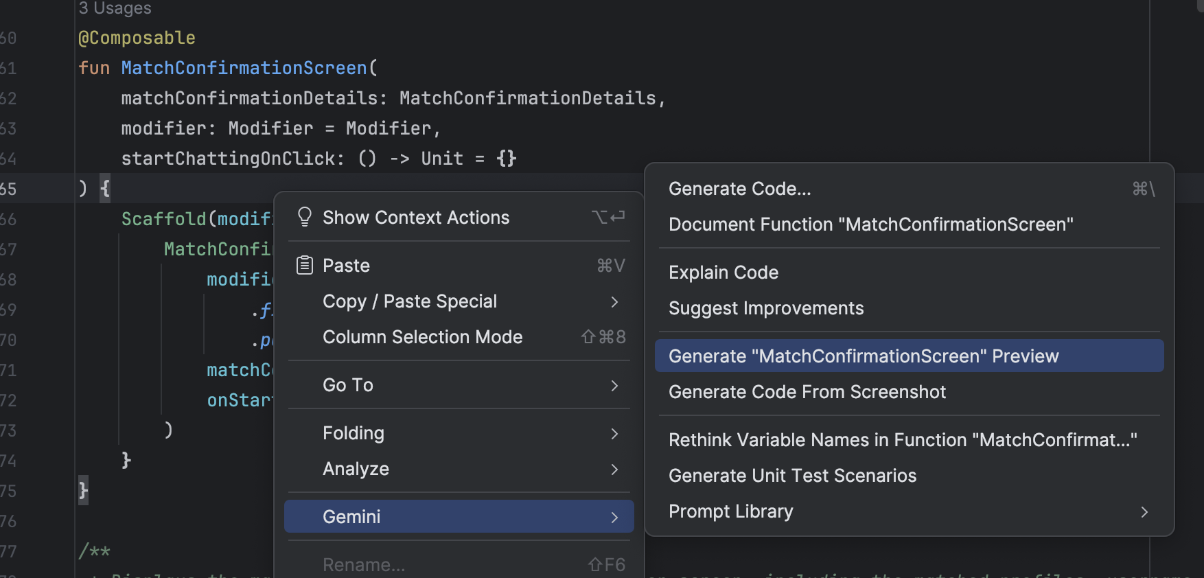• สร้างตัวอย่าง Compose: ตอนนี้ฟีเจอร์นี้ได้รับการปรับปรุงโดยเอเจนต์ Gemini เพื่อให้ผลลัพธ์ที่แม่นยำยิ่งขึ้น เมื่อทำงานในไฟล์ที่มีฟังก์ชันที่ใช้ร่วมกันได้แต่ไม่มีคำอธิบายประกอบ @Preview คุณสามารถคลิกขวาที่ฟังก์ชันที่ใช้ร่วมกันได้ แล้วเลือก Gemini > สร้างตัวอย่าง [ชื่อฟังก์ชันที่ใช้ร่วมกันได้] ตอนนี้เอเจนต์จะวิเคราะห์องค์ประกอบของคุณได้ดีขึ้น เพื่อสร้างบอยเลอร์เพลตที่จำเป็น พร้อมพารามิเตอร์ที่ถูกต้อง เพื่อช่วยยืนยันว่าได้เพิ่มตัวอย่างที่แสดงผลสำเร็จแล้ว