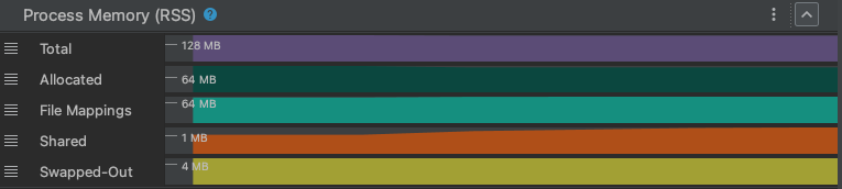 באפליקציות שמופעלות במכשירים עם Android מגרסה 9 ואילך, בקטע Process Memory (RSS) מוצגת כמות הזיכרון הפיזי שמשמשת כרגע את האפליקציה.