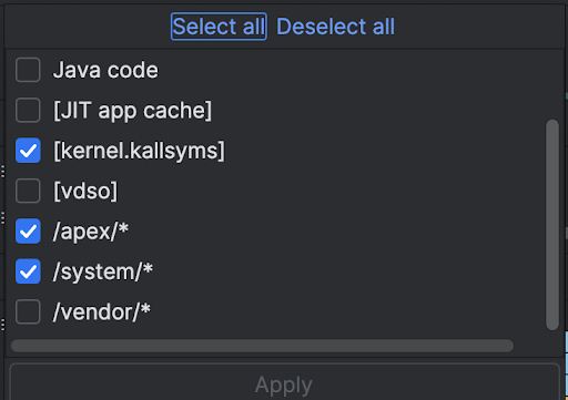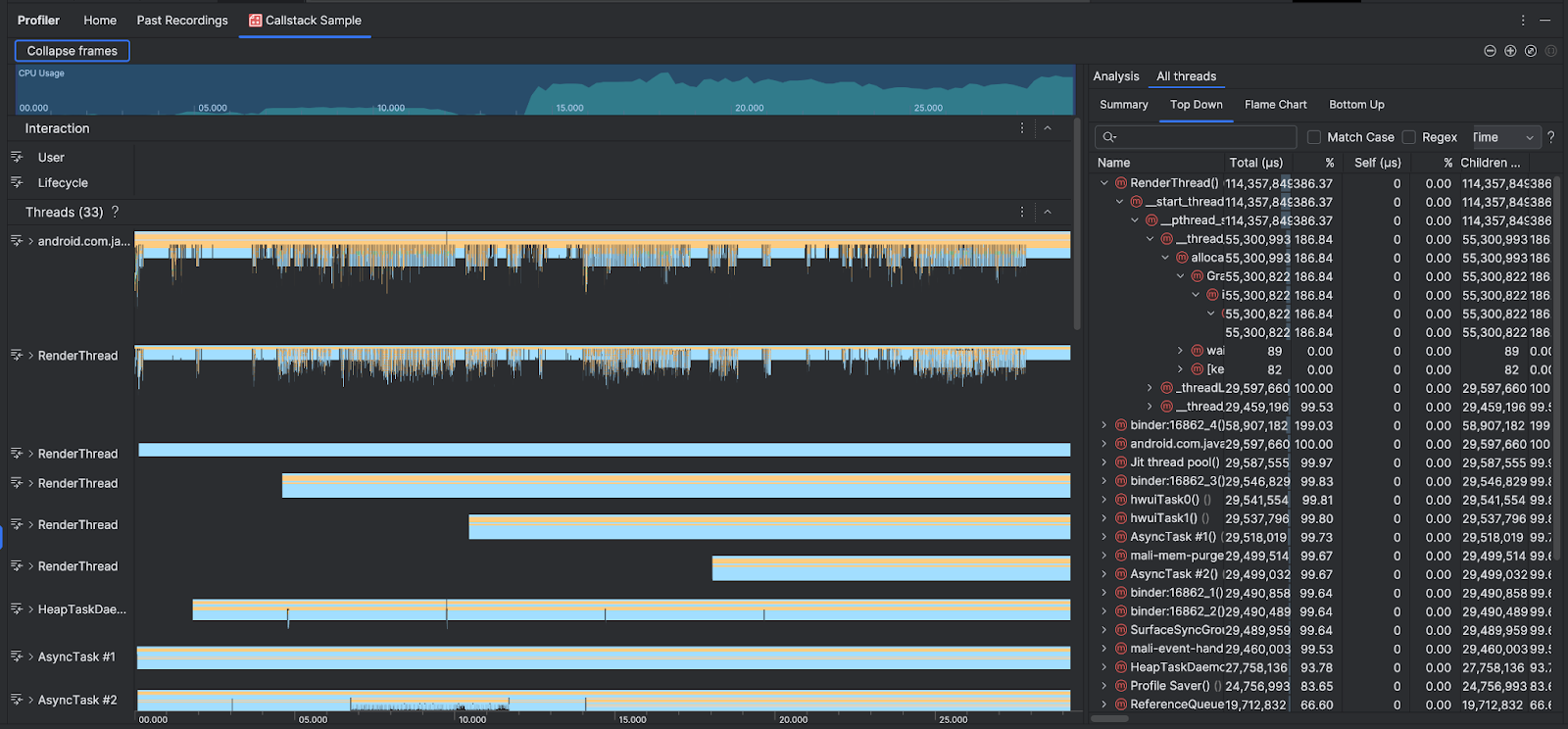 सीपीयू के इस्तेमाल और इंटरैक्शन टाइमलाइन के साथ-साथ, थ्रेड सेक्शन में, आपके ऐप्लिकेशन और सिस्टम की ओर से किए गए हर कॉल के लिए फ़्रेम दिखाए जाते हैं. कॉलस्टैक के सैंपल पर जाने के लिए यहां कुछ सुझाव दिए गए हैं: