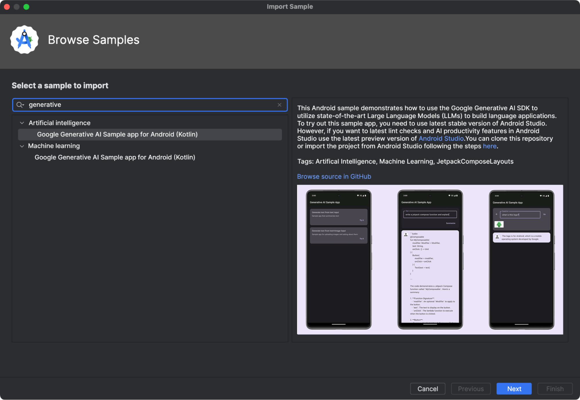 Узнайте больше о Google AI SDK для Android, ознакомившись с кратким руководством Google AI SDK для Android. Чтобы получить ещё больше примеров кода, импортируйте пример кода Generative AI в Android Studio, выбрав Файл > Создать > Импортировать пример и выполнив поиск по запросу Generative AI Sample .
