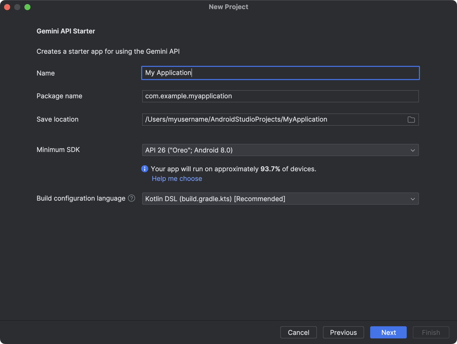 เริ่ม Android Studio แล้วเปิดโปรเจ็กต์ใหม่โดยใช้ไฟล์ > โปรเจ็กต์ใหม่ เลือกเทมเพลต Gemini API Starter