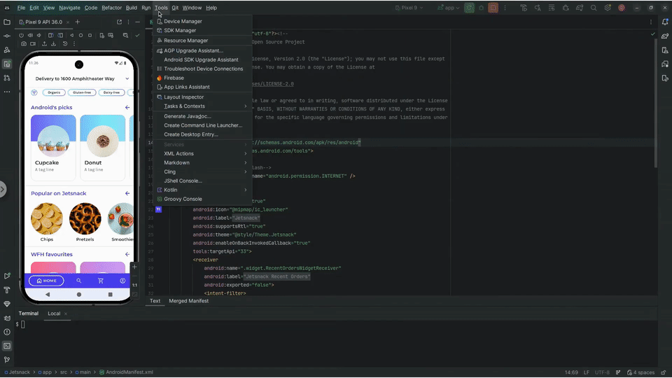 KI-Assistenten in Android Studio haben jetzt Zugriff auf Tools, mit denen eine Anwendung auf dem verbundenen Gerät bereitgestellt, der aktuelle Bildschirminhalt geprüft, Screenshots erstellt, Logcat auf Fehler untersucht und über adb shell input mit der ausgeführten Anwendung interagiert werden kann. So kann der Kundenservicemitarbeiter Ihnen bei Änderungen oder Korrekturen helfen, die das erneute Ausführen der Anwendung, die Suche nach Fehlern und die Bestätigung umfassen, dass ein bestimmtes Update erfolgreich durchgeführt wurde (z. B. durch Aufnehmen und Überprüfen von Screenshots).