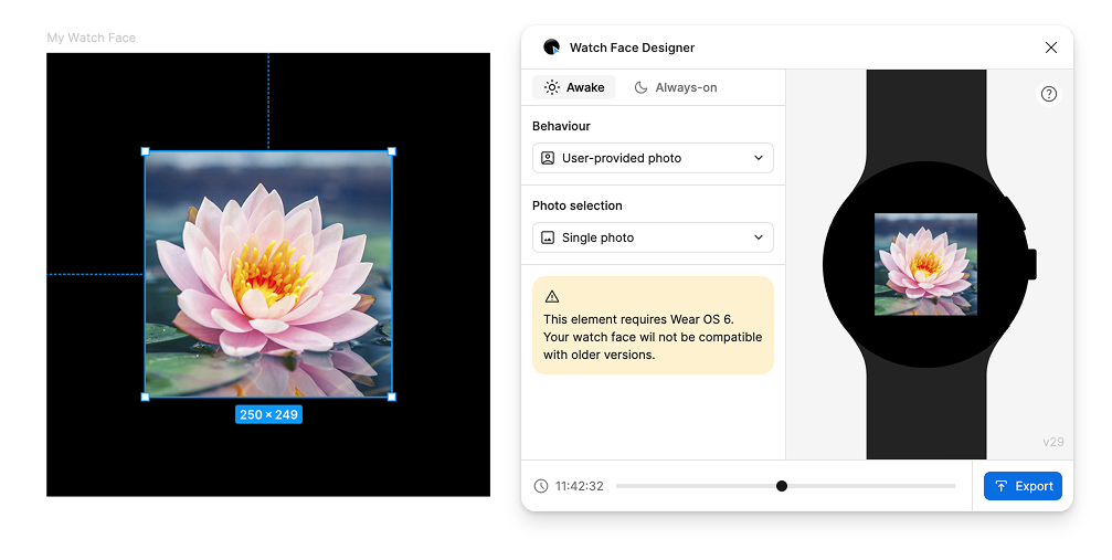 Para admitir fotos personalizadas, agrega una capa a la cara de reloj y configura su Comportamiento como "Foto proporcionada por el usuario". En este ejemplo, usaremos una fotografía de muestra de una flor para esta capa como imagen predeterminada. Esta imagen se usa como alternativa antes de que el usuario asigne su propia foto o cuando elige no usar una de sus fotos.